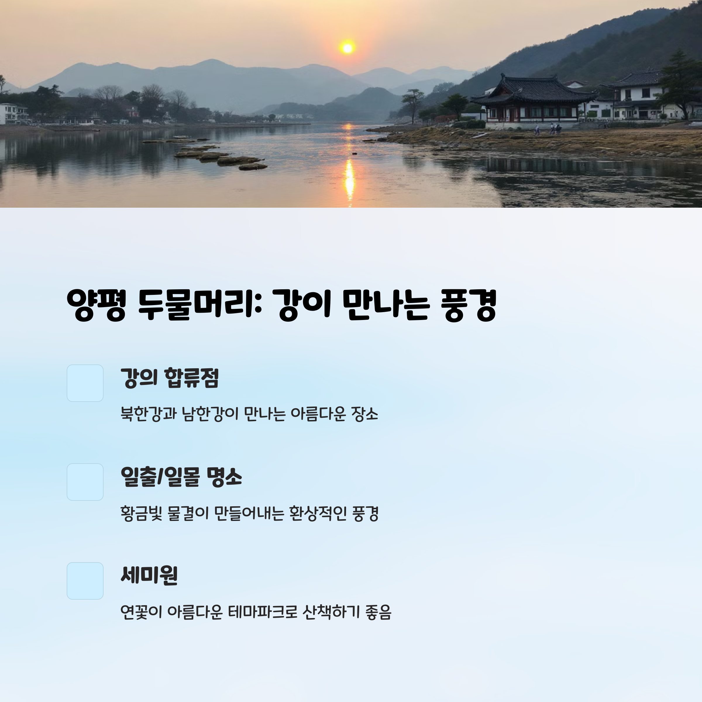 | 자연과 낭만이 가득한 가평 & 남이섬 코스 | 두물머리와 호수공원의 벚꽃 명소 정보 | 석모도 미네랄 온천에서의 피로 회복 |