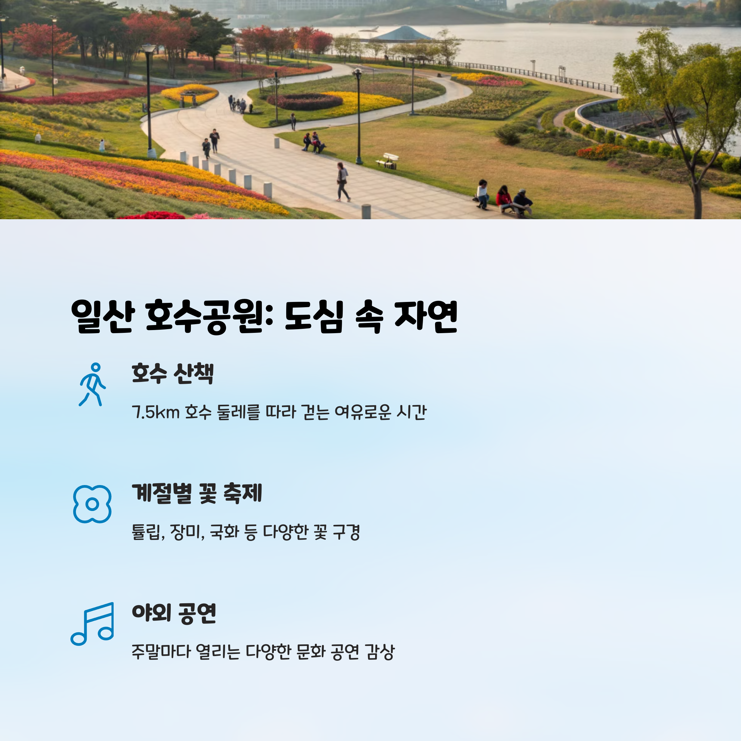 강화도와 석모도는 자연의 고요함을 느끼기에 좋은 곳입니다. 특히 석모도 미네랄 온천은 여행 중 쌓인 피로를 풀기에 딱 알맞습니다. 마지막으로 일산 호수공원은 도심 속에서도 봄꽃과 여유를 즐길 수 있는 장소로, 시간 여유가 없는 분들에게도 추천할 만한 힐링 포인트입니다.