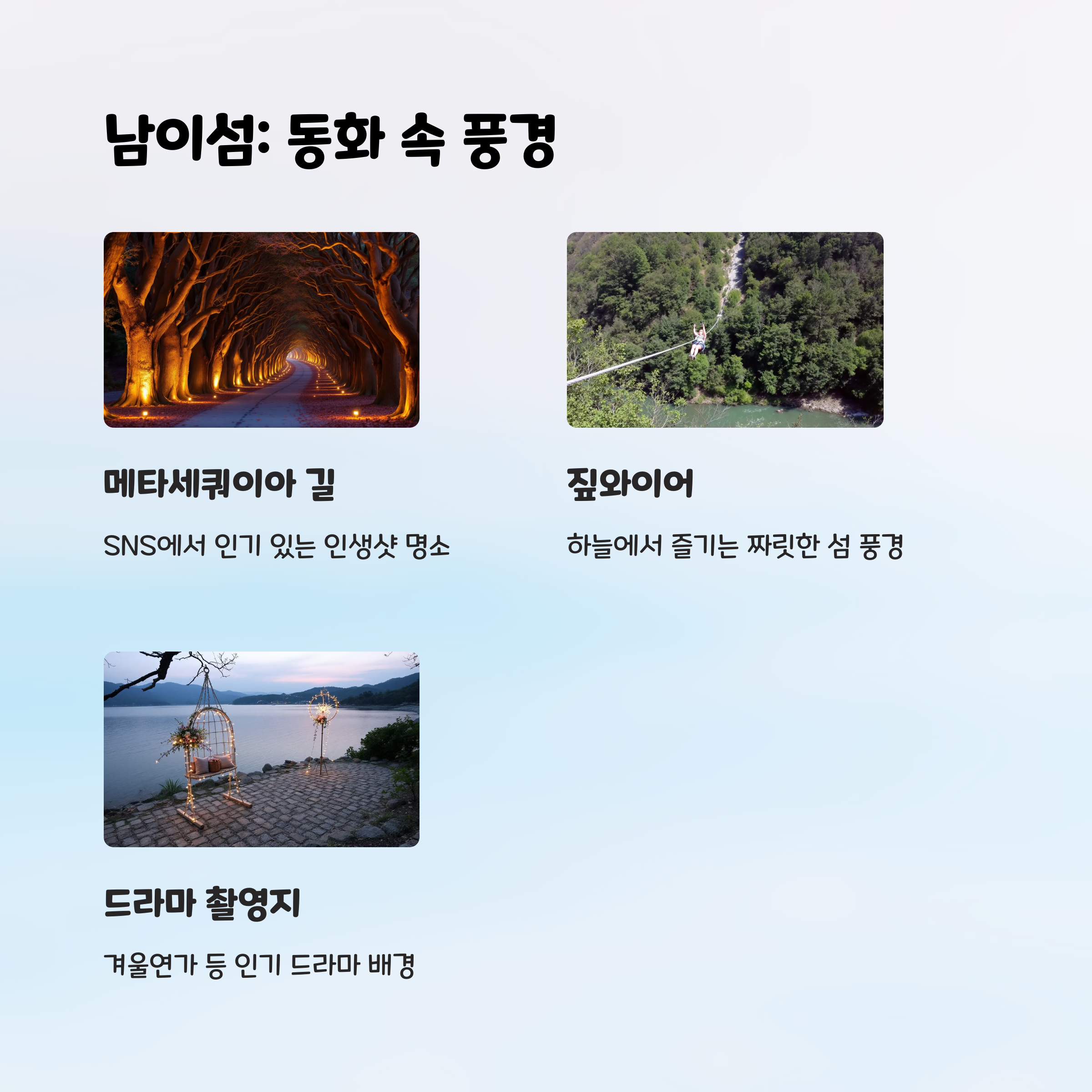 서울 근교의 당일치기 여행 코스는 짧은 시간이지만 자연과 문화를 모두 경험할 수 있는 훌륭한 선택입니다. 특히 가평과 남이섬은 자연경관이 뛰어나고 사계절 모두 색다른 매력을 느낄 수 있는 곳입니다. 아침에는 아침고요수목원에서 조용한 산책을 즐기며 꽃과 나무들이 선사하는 평화를 만끽할 수 있고, 이어서 남이섬에서는 자전거를 타거나 강변 산책을 하며 봄바람과 벚꽃 사이로 낭만적인 시간을 보내기에 딱 좋습니다. 짧지만 밀도 높은 힐링이 가능한 이 코스는 누구에게나 만족감을 줄 수 있습니다.