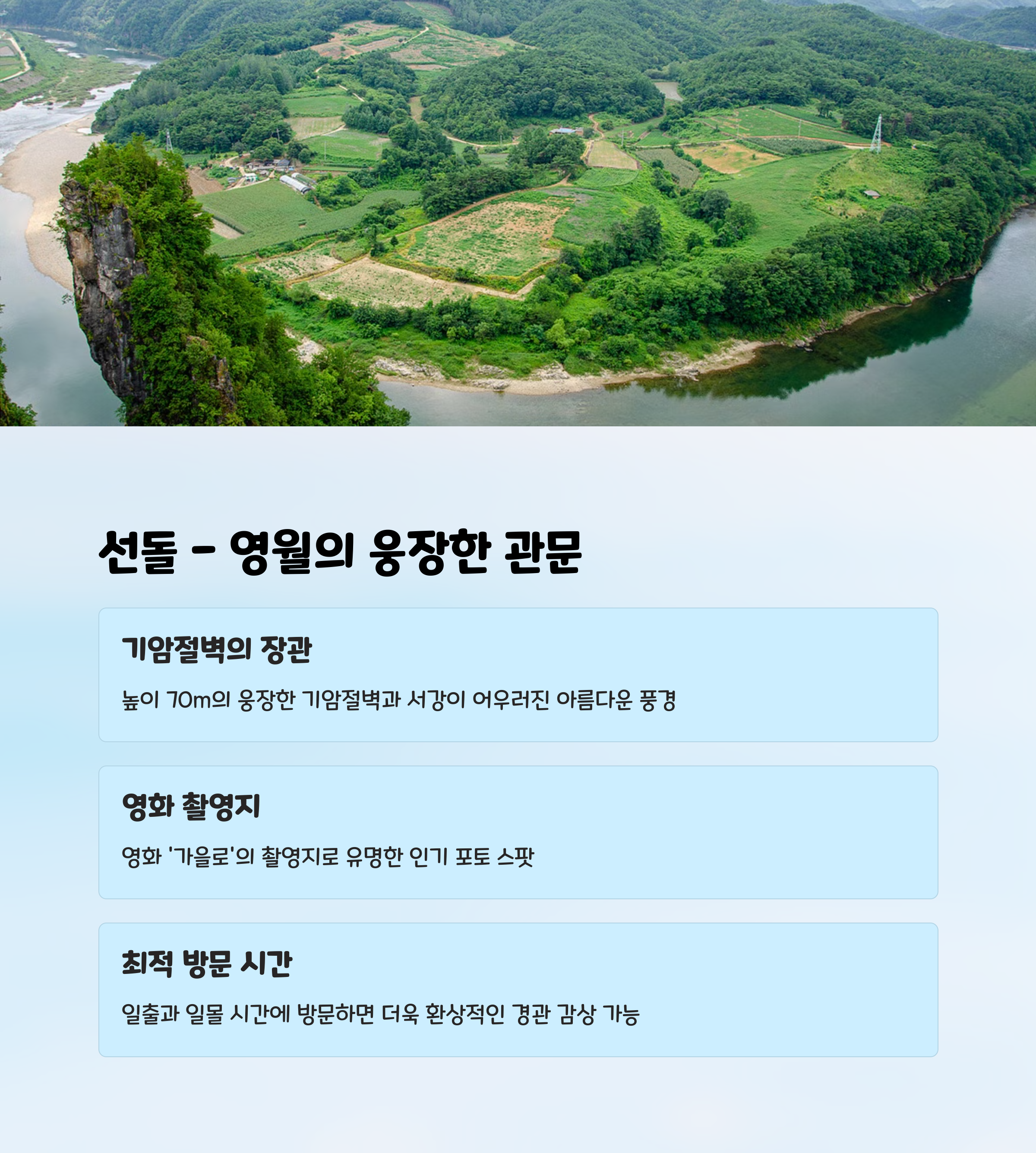 짧은 시간이지만 알찬 여행을 즐기고 싶다면 강원도 영월은 더없이 좋은 선택입니다. 영월은 역사와 자연, 문화가 고루 어우러진 여행지로, 당일치기 일정으로도 충분히 만족스러운 일정을 구성할 수 있습니다. 영화의 한 장면처럼 펼쳐지는 기암절벽 선돌부터, 단종의 비극이 담긴 장릉과 청령포, 그리고 한반도를 닮은 풍경이 인상적인 한반도지형 전망대까지. 여기에 5억 년 전 동굴을 탐험하는 고씨동굴, 감각적인 예술 전시가 가득한 젊은달와이파크, 김삿갓의 삶을 만나는 문학관까지 포함하면 단 하루 만에 역사와 문화, 자연을 모두 아우르는 멋진 여행이 가능합니다. 오늘은 당일치기 영월 여행지 7곳을 핵심 정리하여 소개해드릴게요. 여행 계획을 세우는 분들께 많은 도움이 되길 바랍니다.
