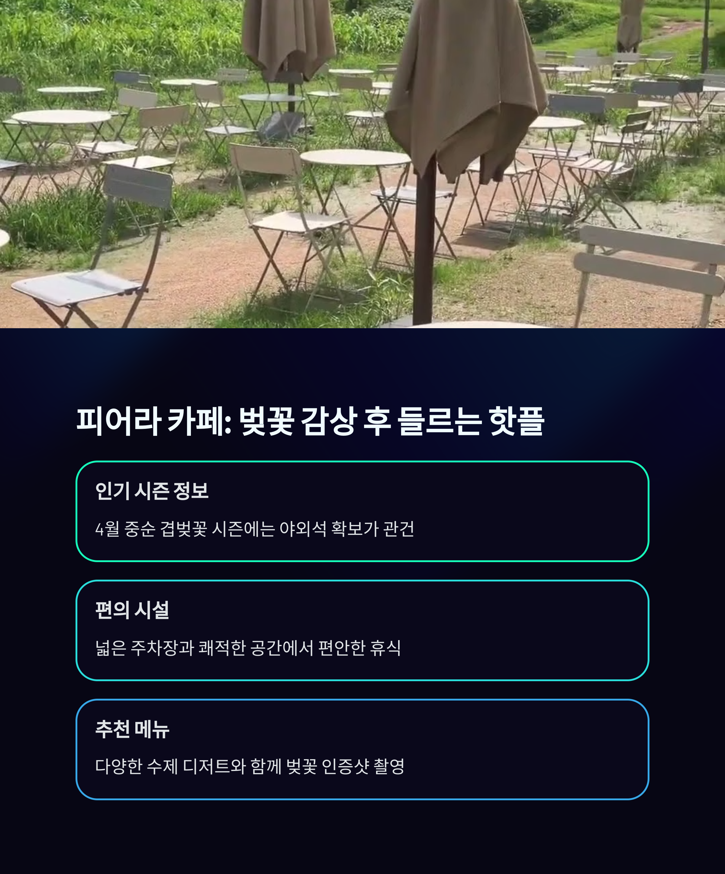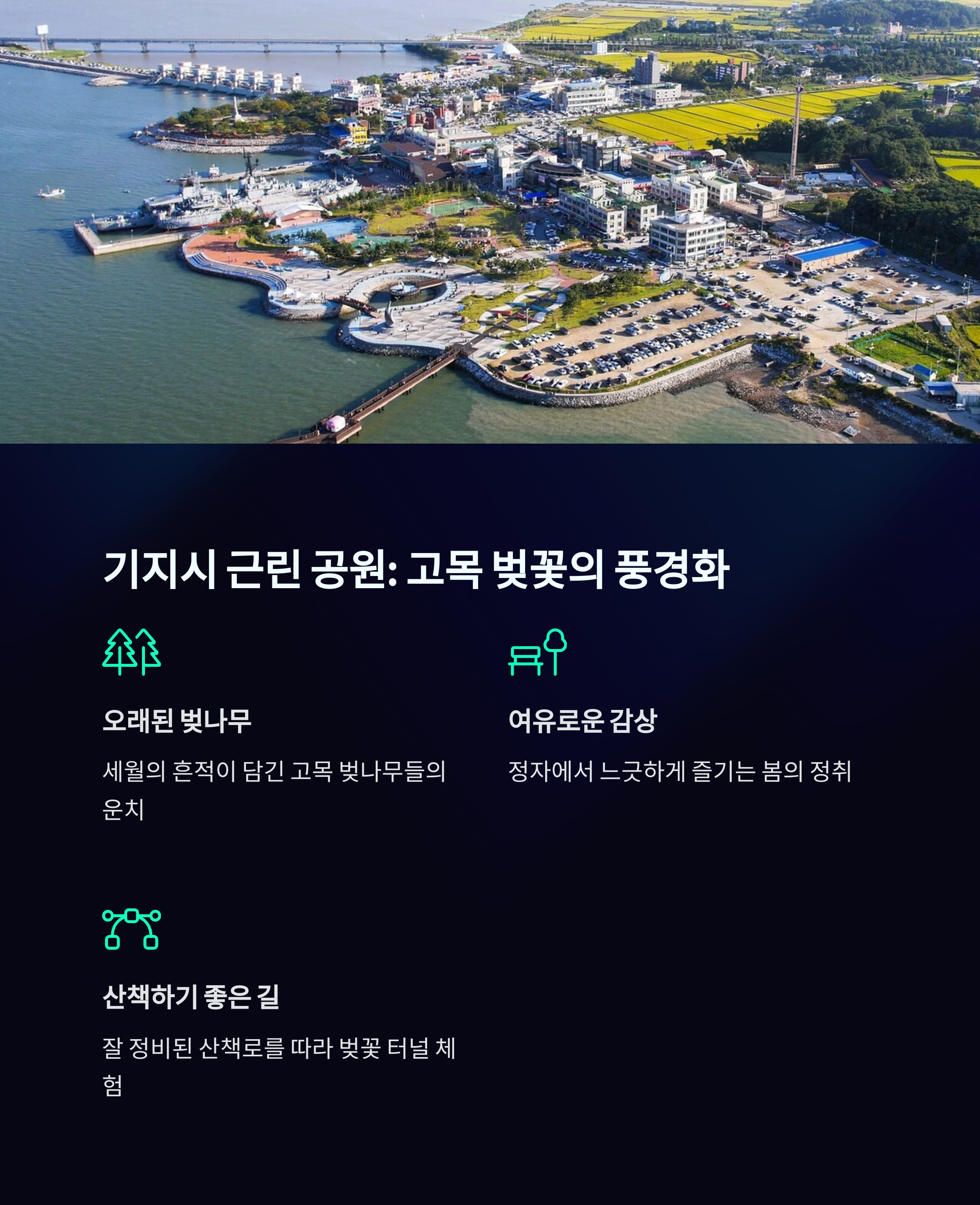 기지시근린공원은 고목 벚나무와 잘 정비된 산책로가 어우러져 조용히 걷기 좋은 공간입니다. 노년층부터 어린아이를 동반한 가족까지 편하게 이용할 수 있으며, 겹벚꽃 나무 아래에서 인생샷을 남기기도 좋습니다. 이와 함께 들러볼만한 피어라카페는 겹벚꽃 시즌이면 방문객이 급증하는 인기 스팟으로, 넓은 야외석과 여유로운 주차장, 풍경 좋은 뷰까지 더해져 당진 벚꽃 나들이의 마무리 장소로 추천됩니다.