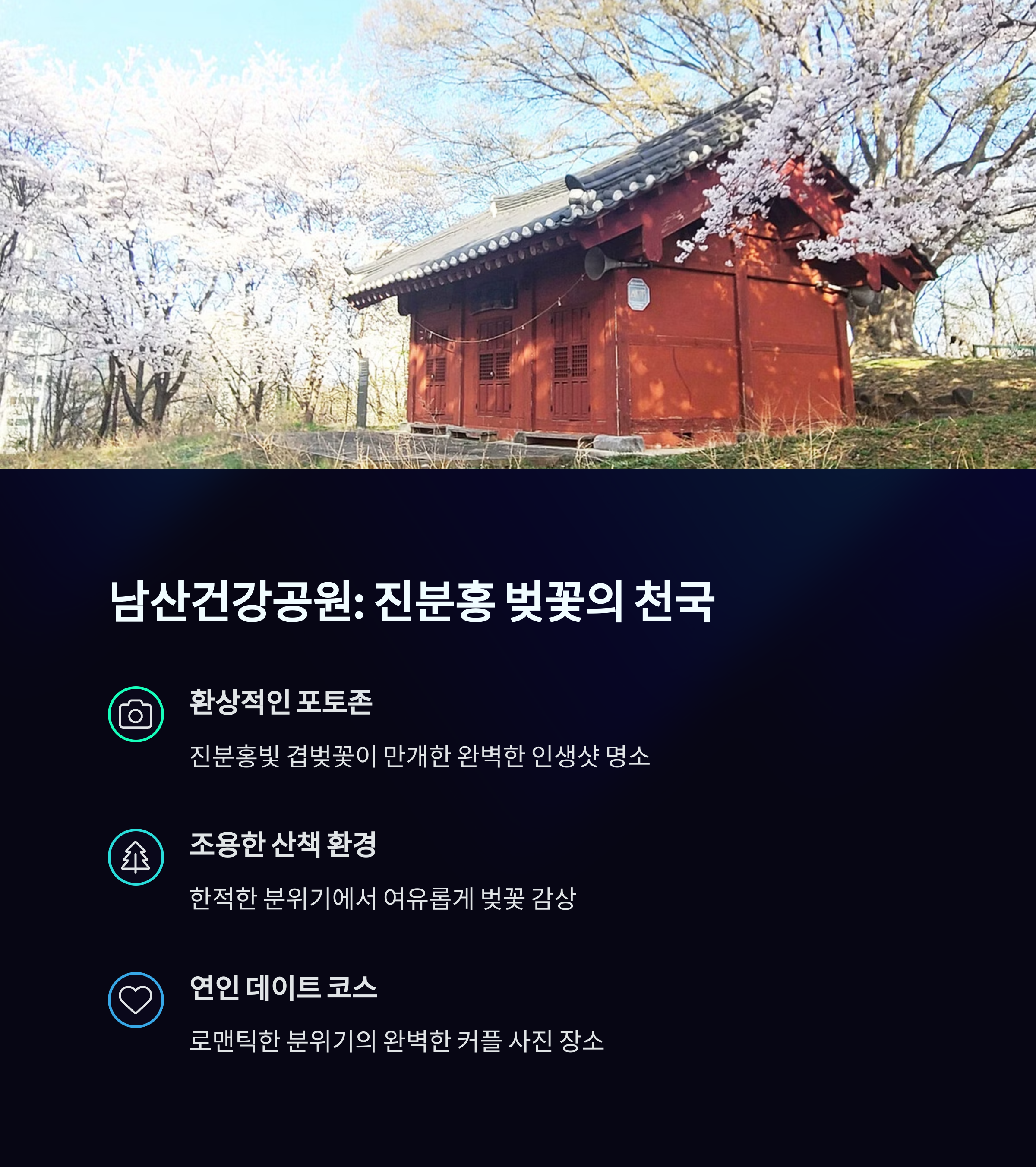 겹벚꽃 시즌이 되면 남산건강공원은 분홍빛으로 물든 풍경 덕분에 당진 시민들 사이에서 조용한 벚꽃 명소로 알려집니다. 일반 벚꽃보다 화사하고 풍성한 겹벚꽃이 피어나며, 군데군데 놓인 벤치와 포토존 덕분에 산책 중 사진을 남기기에도 좋습니다. 복잡하지 않고 한적한 분위기 속에서 봄을 만끽할 수 있어, 가족 단위는 물론 혼산·혼캠을 즐기는 분들에게도 추천할 만한 장소입니다.