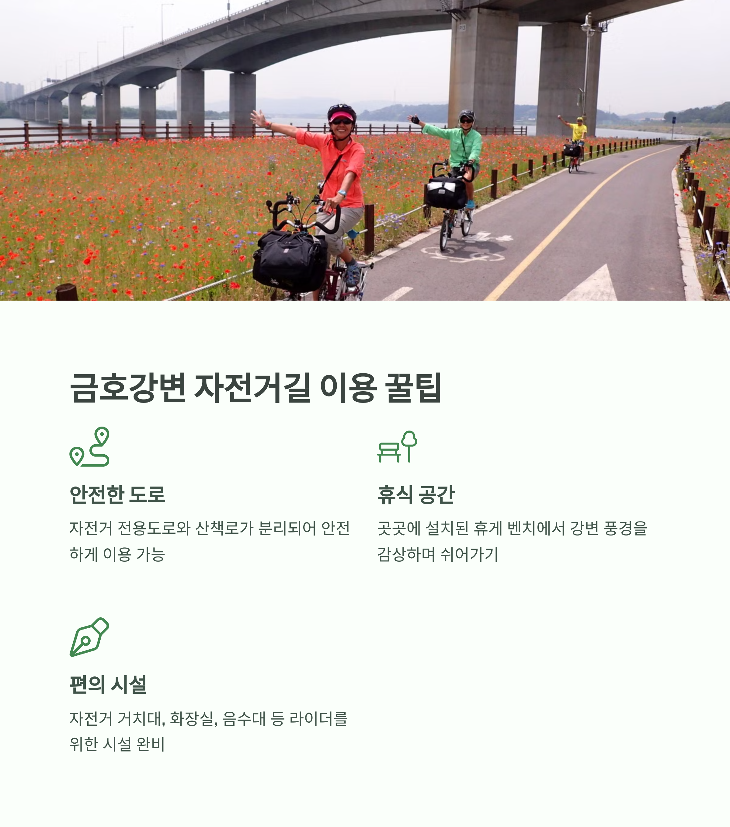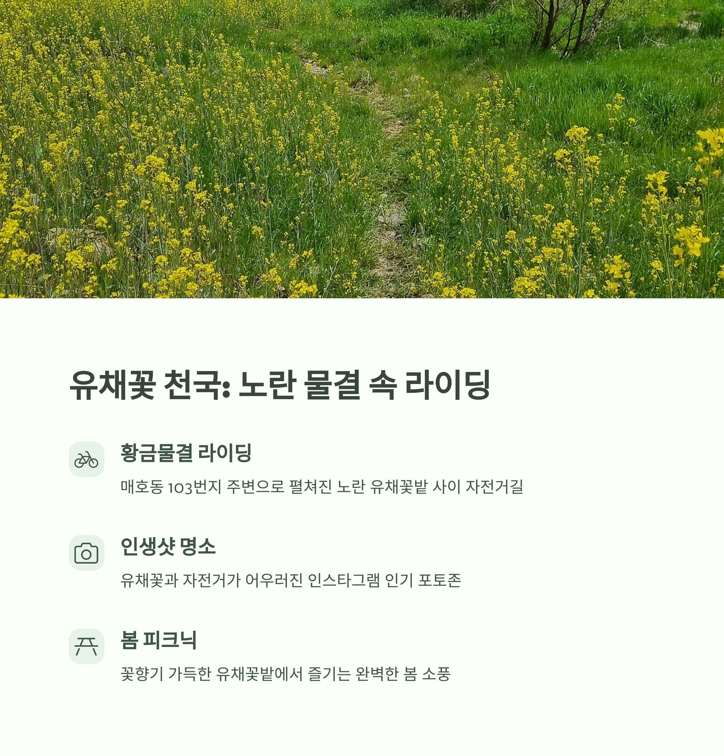 봄꽃이 흐드러지는 금호강 자전거길은 라이딩, 산책, 피크닉, 캠핑까지 모두 가능한 대구의 대표 봄 힐링 코스입니다. 하루 종일 자전거를 타고 꽃길을 달리다가, 해질 무렵 캠핑장에 머물며 자연 속 여유로운 하루를 보내보세요. 올봄엔 금호강에서 특별한 봄날을 경험해보는 건 어떠세요?