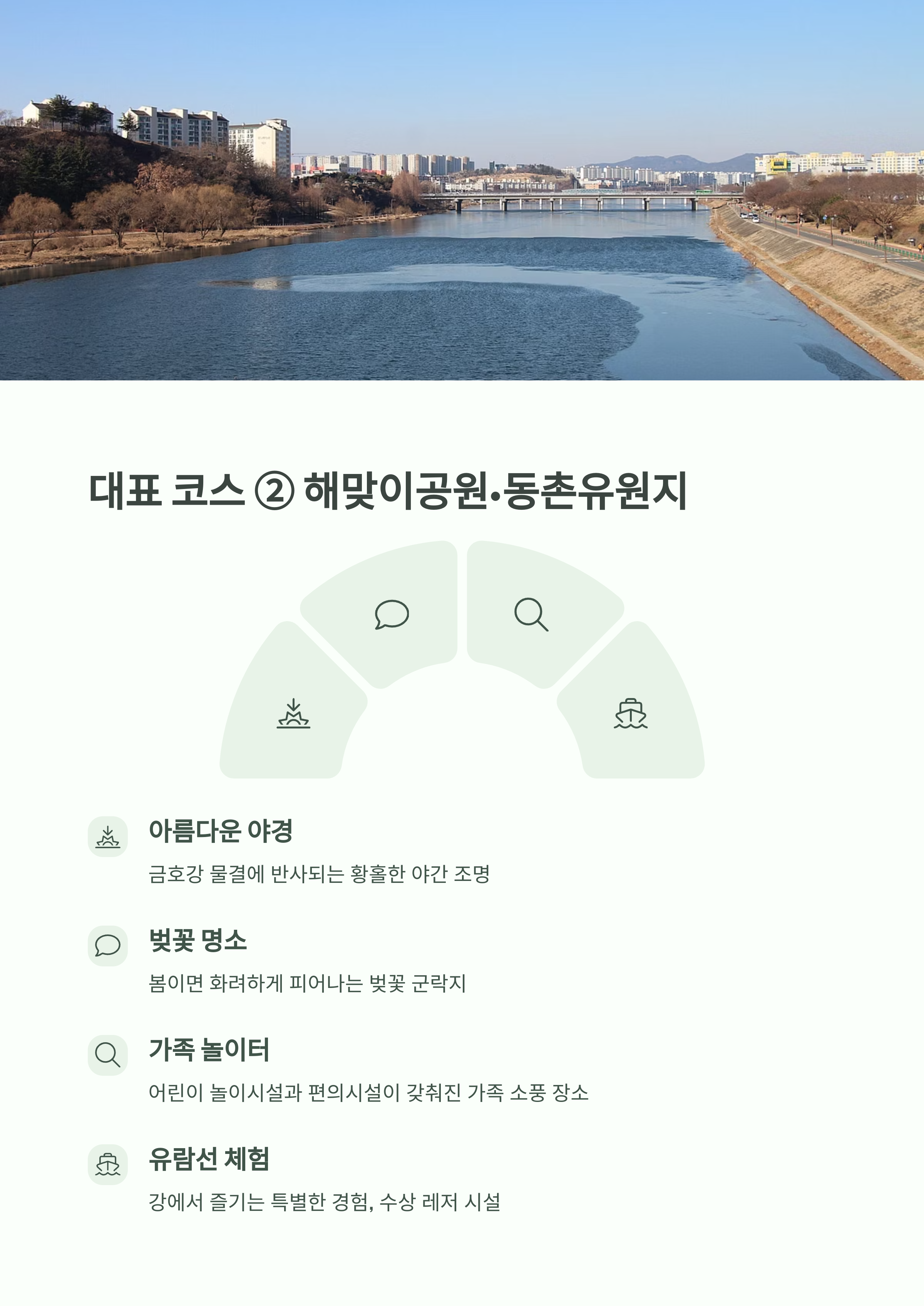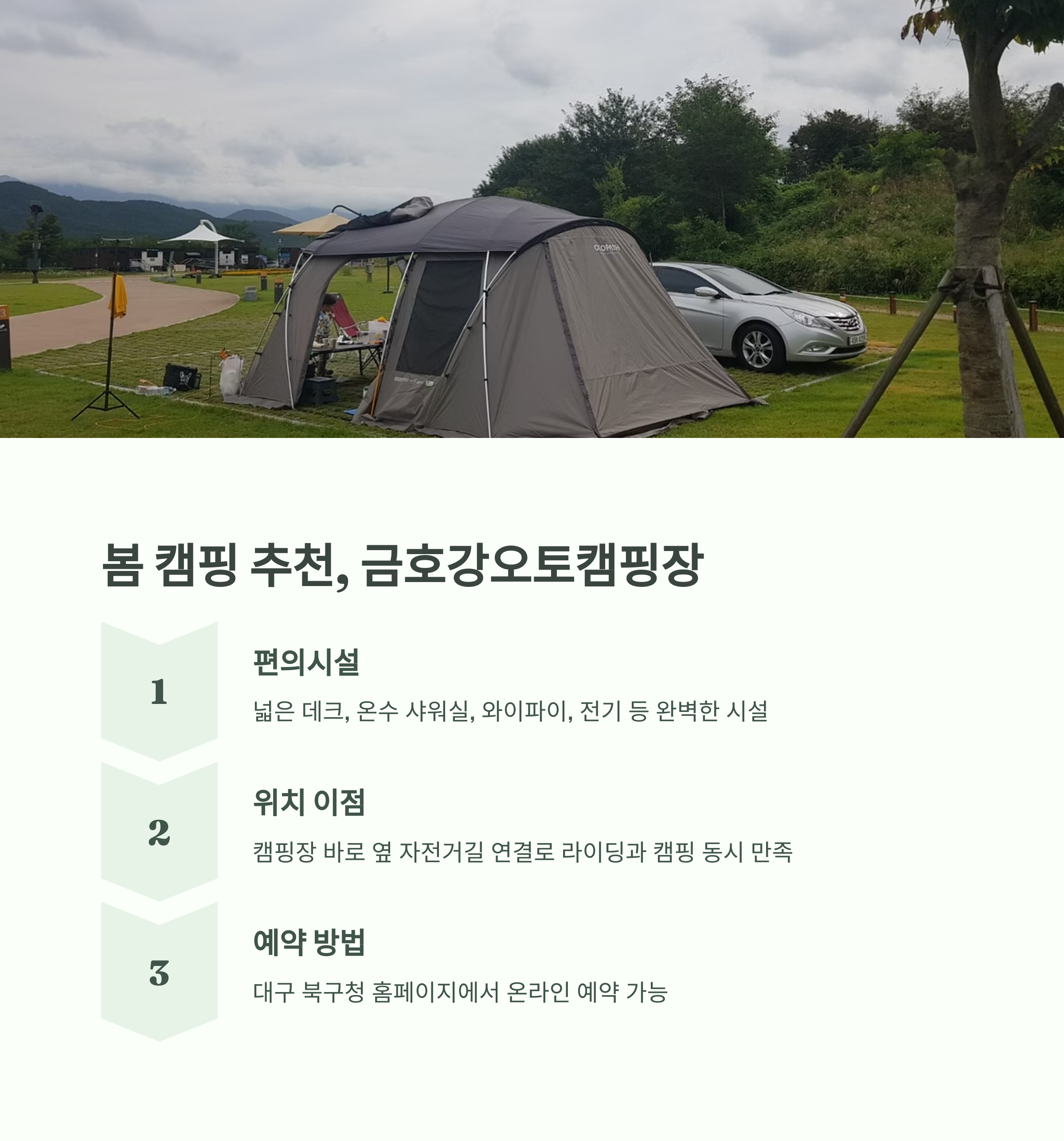 | 금호강생태공원, 해맞이공원 | 자전거 + 벚꽃 + 유채꽃 | 오토캠핑, 온수샤워, 와이파이, 전기 |