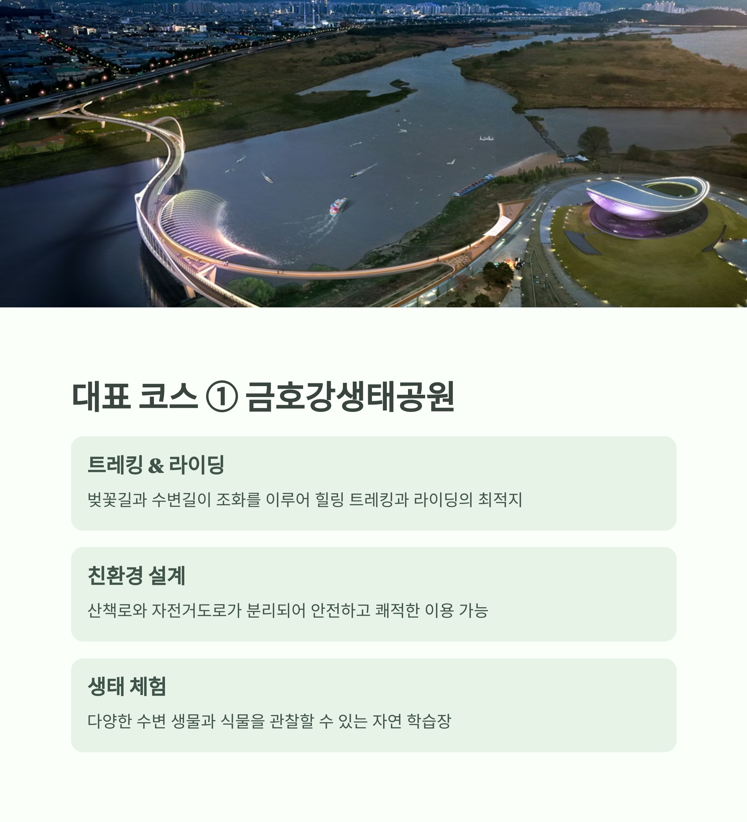 대구 금호강 자전거길은 봄꽃 명소로도 유명한 라이딩 코스입니다. 특히 금호강생태공원~해맞이공원~동촌유원지 구간은 길게 이어진 벚꽃길과 유채꽃밭이 어우러져 자전거를 타며 자연 속을 달리는 듯한 기분을 만끽할 수 있어요. 강변 따라 데크길과 자전거도로가 분리돼 있어 산책하는 이들과의 동선도 안전하게 구분되어 있는 점도 큰 장점입니다.