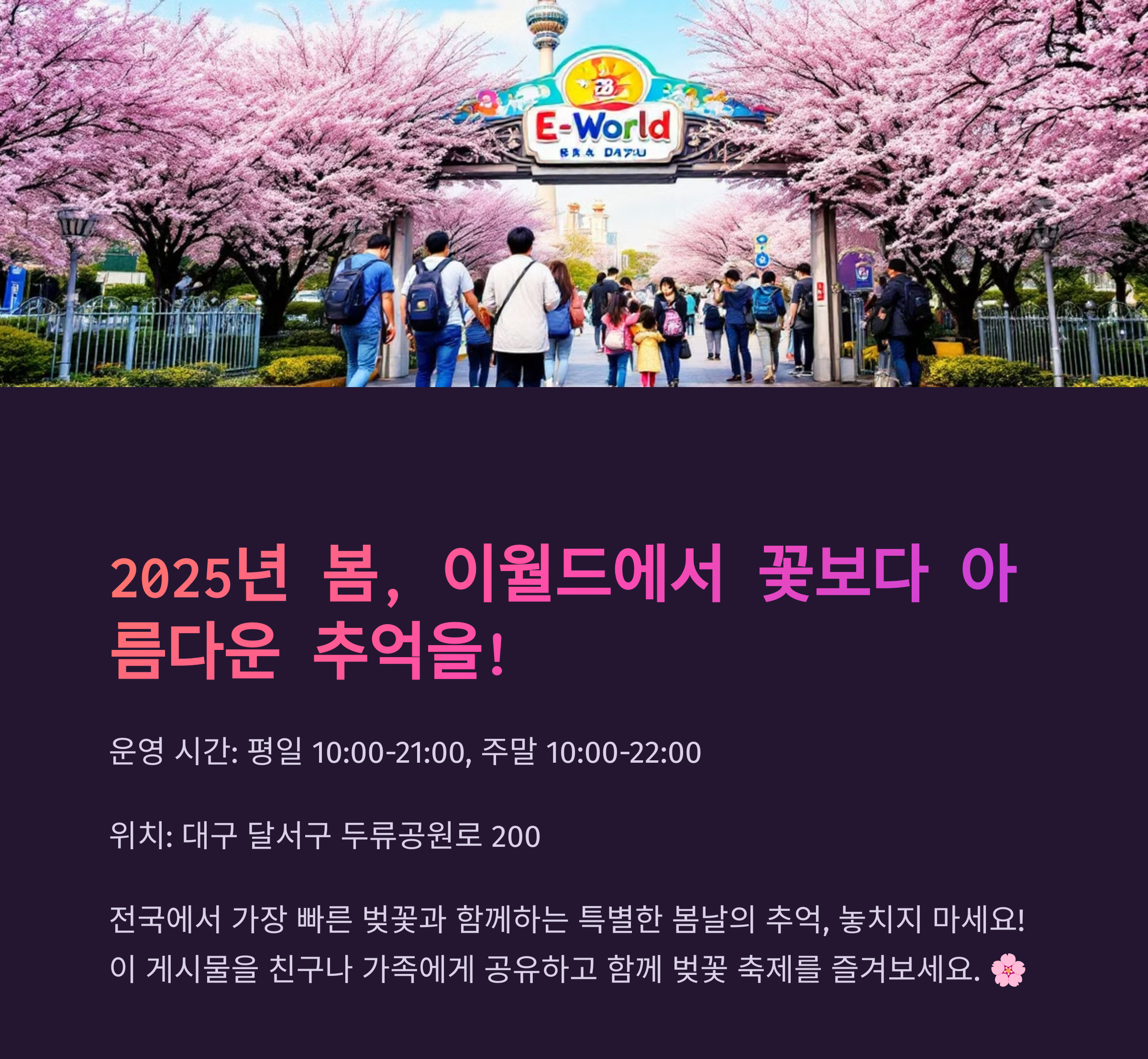 대구 이월드는 벚꽃과 유럽 감성이 어우러진 특별한 장소입니다. 83타워에서 바라보는 대구의 전경, 놀이기구, 다양한 포토존까지 하루 동안 다양한 경험을 할 수 있어 가족, 연인, 친구들에게 완벽한 여행지입니다. 올해 봄, 벚꽃이 만개한 이월드에서 아름다운 추억을 만들어 보세요!