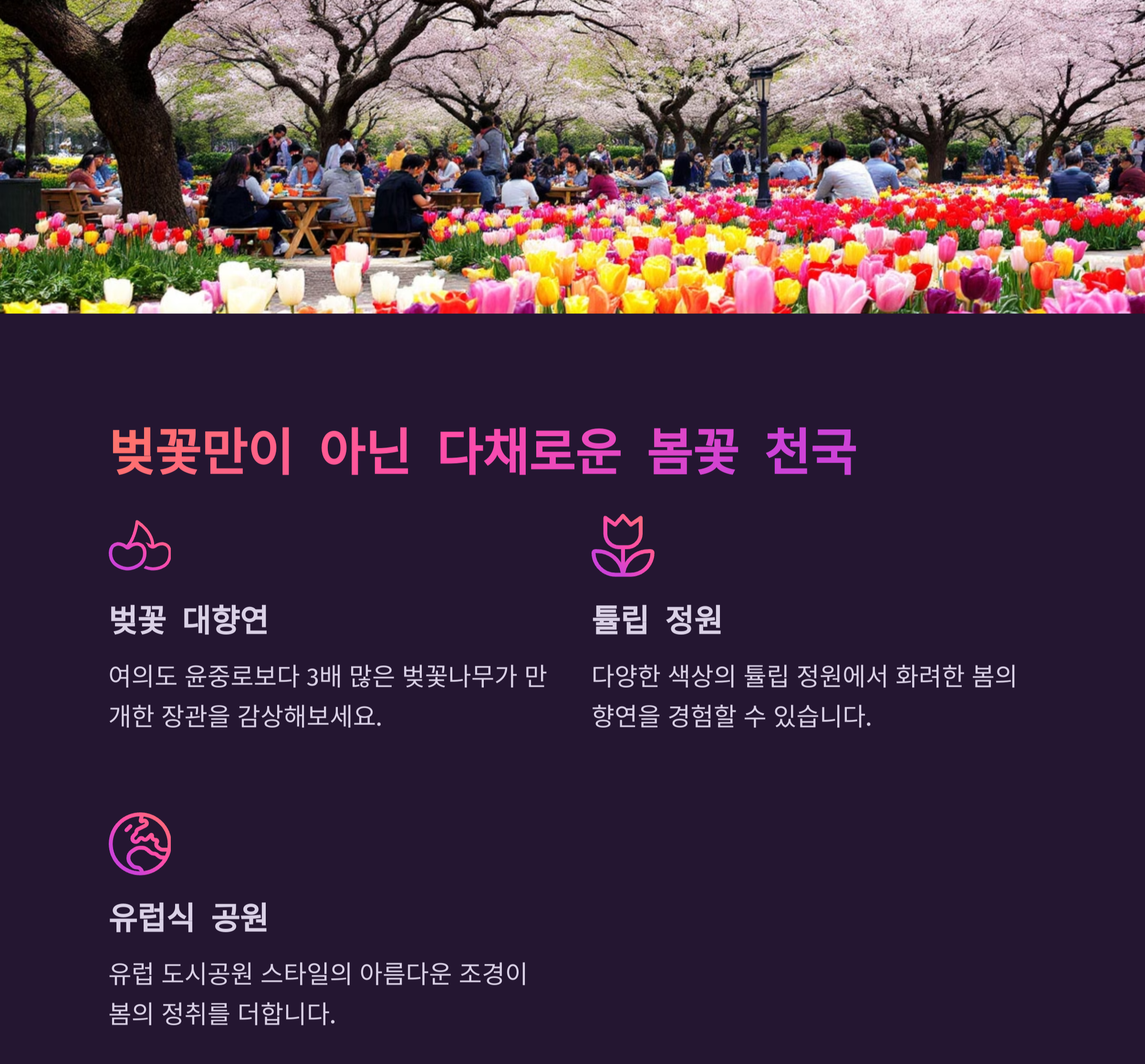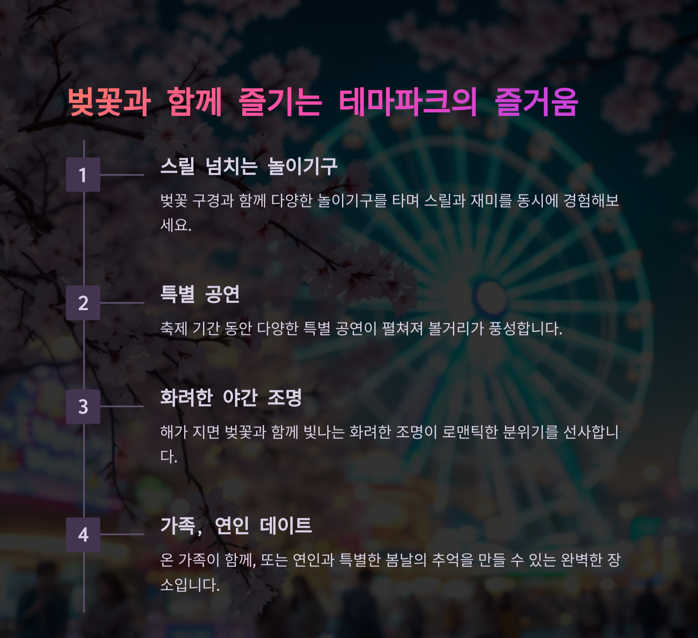 대구 이월드는 벚꽃과 놀이기구를 동시에 즐길 수 있는 국내 유일의 테마파크입니다. 2025년 벚꽃 시즌이 시작되면서 이월드 벚꽃 블라썸 피크닉이 개최되며, 특히 83타워 전망대에서 바라보는 벚꽃 풍경은 압도적입니다. 낮에는 분홍빛 벚꽃이 만개한 공원을 거닐고, 밤에는 조명이 어우러진 야경 속 벚꽃을 감상할 수 있어 하루 종일 특별한 경험이 가능합니다. 또한 이월드는 튤립, 유채꽃, 팬지 등 다양한 봄꽃이 조화롭게 어우러져, 더욱 다채로운 풍경을 선사합니다.