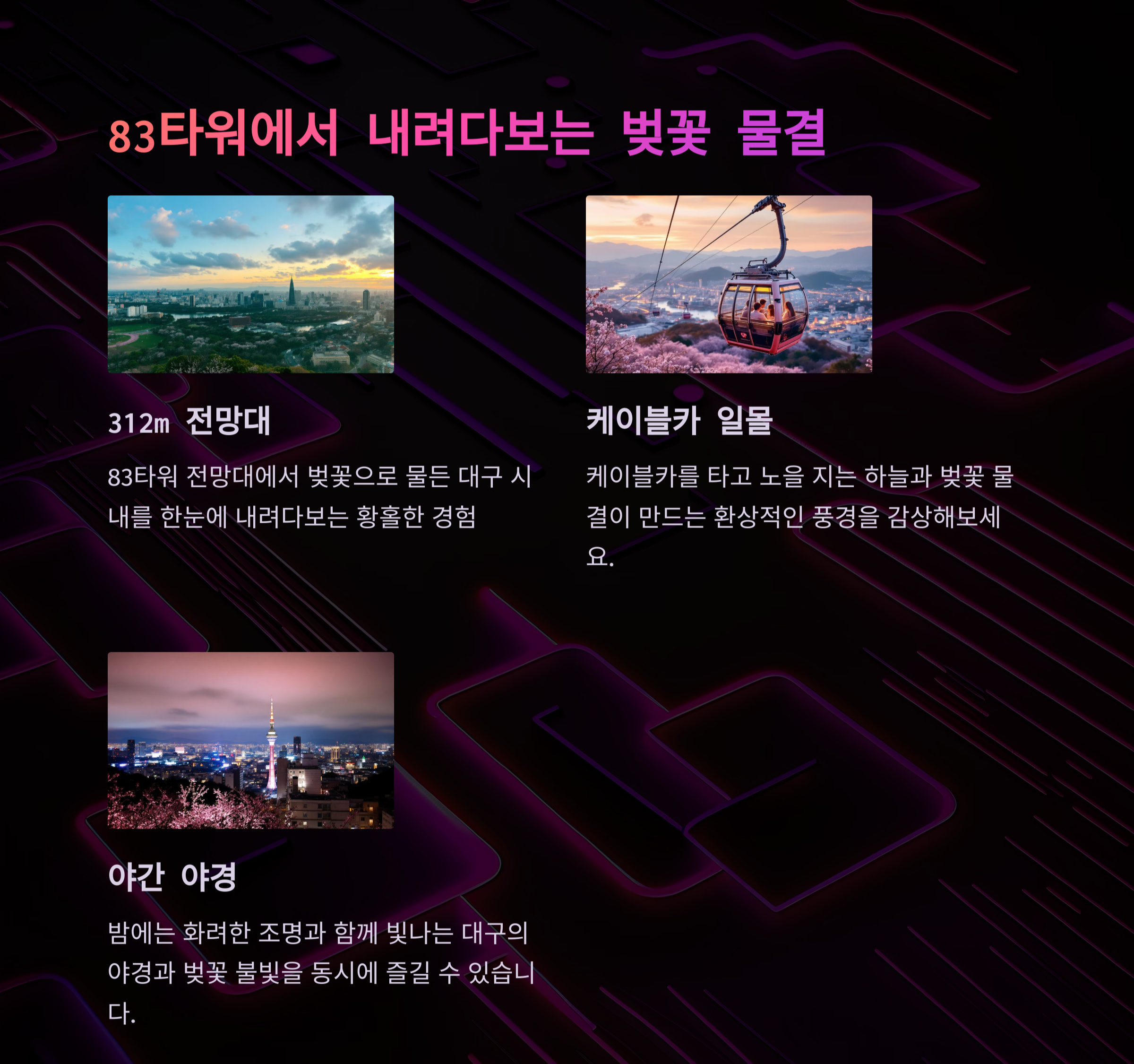 312m 높이의 83타워 전망대에서는 대구 시내를 한눈에 볼 수 있으며, 케이블카를 이용하면 공중에서 아름다운 일몰과 벚꽃을 동시에 감상할 수 있습니다. 가족, 연인, 친구 모두에게 적합한 여행지로, 봄날의 추억을 만들기에 최적의 장소입니다.