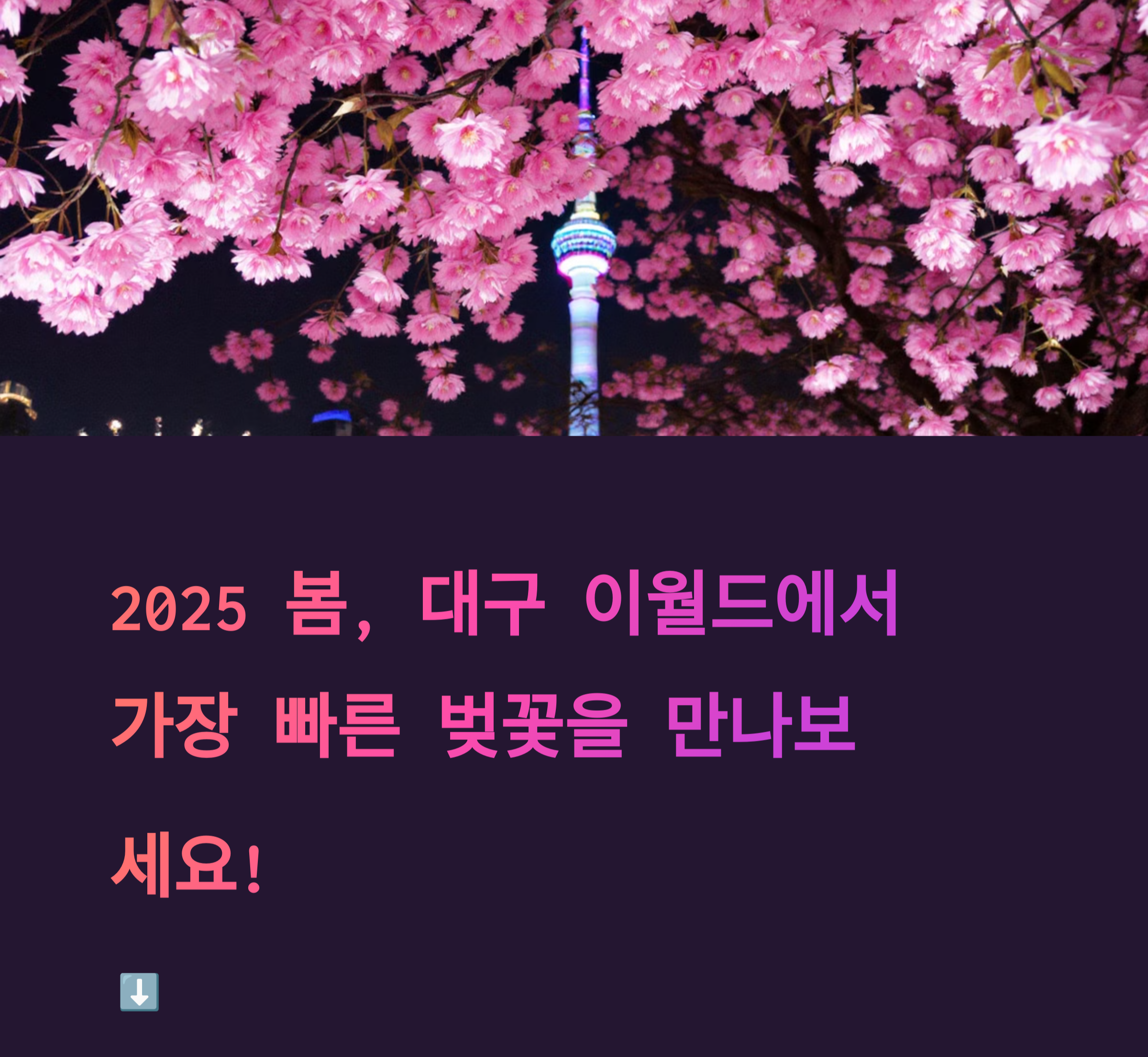 따뜻한 봄바람이 불어오는 2025년, 대구 이월드에서는 벚꽃 블라썸 피크닉 축제가 열립니다. 이곳은 전국에서 가장 빠르게 벚꽃이 피는 명소로, 여의도 윤중로보다 세 배나 많은 벚꽃나무가 장관을 이룹니다. 특히 야간 벚꽃의 화려함은 한국 최대 규모로, 로맨틱한 분위기를 연출합니다. 83타워를 둘러싼 벚꽃과 빨간 2층 버스, 회전목마 등 수백 개의 포토존이 마련되어 있어, 사진을 찍기에도 완벽한 장소입니다. 또한 벚꽃뿐만 아니라 튤립과 다양한 봄꽃도 함께 피어, 더욱 다채로운 봄 풍경을 감상할 수 있습니다. 대구를 여행하며 하루 동안 이월드를 방문하는 것은 최고의 선택이 될 것입니다. 놀이기구, 공연, 전망대까지 한 번에 즐길 수 있는 이월드에서 봄날의 추억을 만들어보세요!