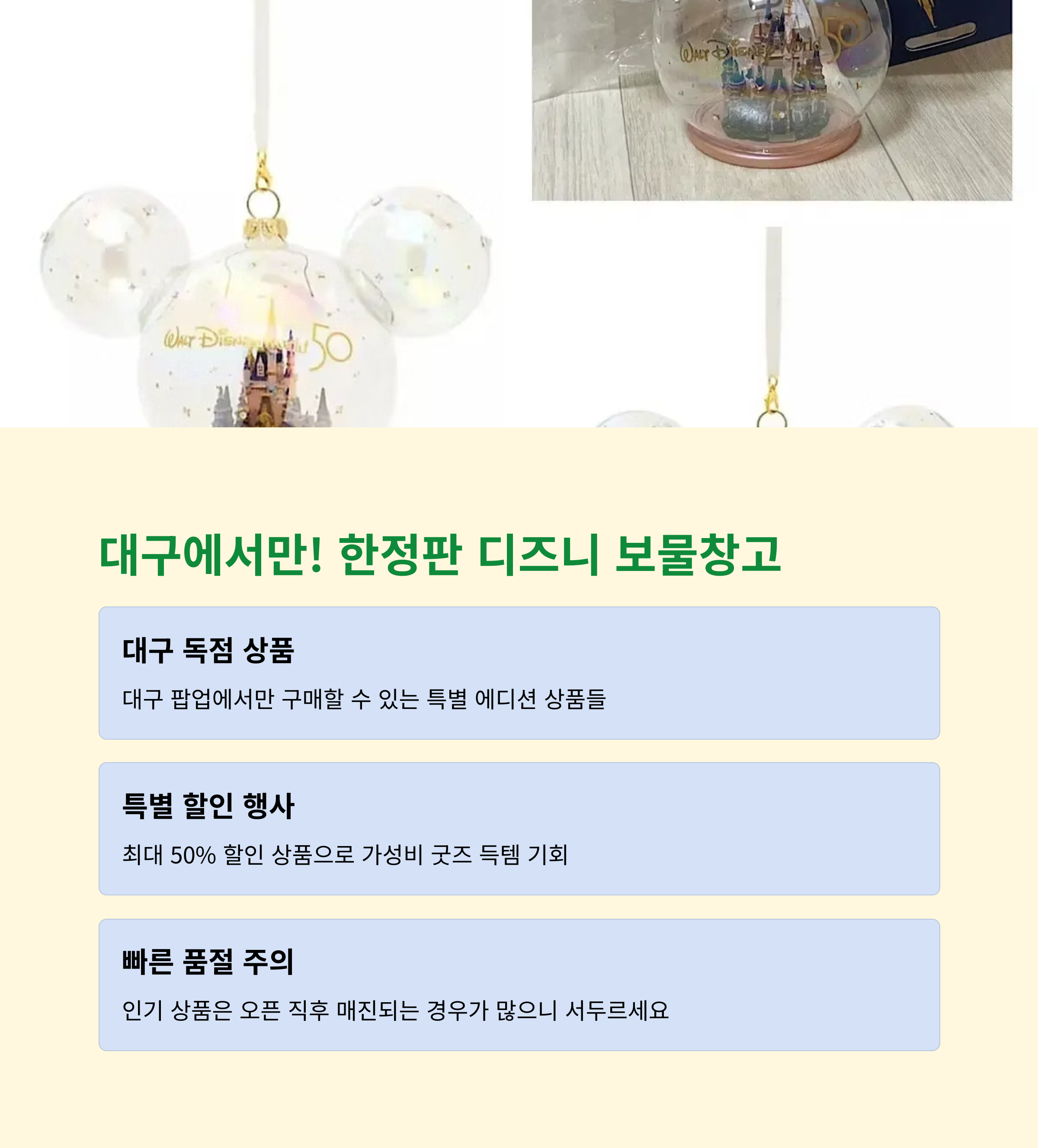 날씨 상관없이 실내에서 쾌적하게 즐길 수 있는 대구 디즈니스토어 팝업은 귀여운 굿즈, 감성 포토존, 쇼핑의 즐거움을 한 번에 누릴 수 있어 커플 데이트 코스로 딱 맞는 장소입니다. 알차게 꾸며진 공간 덕분에 시간 가는 줄 모르고 머물 수 있으며, 주변 맛집과 카페까지 더해진 완성도 높은 데이트 루트를 구성할 수 있습니다. 실내 데이트 장소를 찾고 있다면 이번 주말엔 디즈니스토어 팝업으로 감성 가득한 하루를 보내보세요!