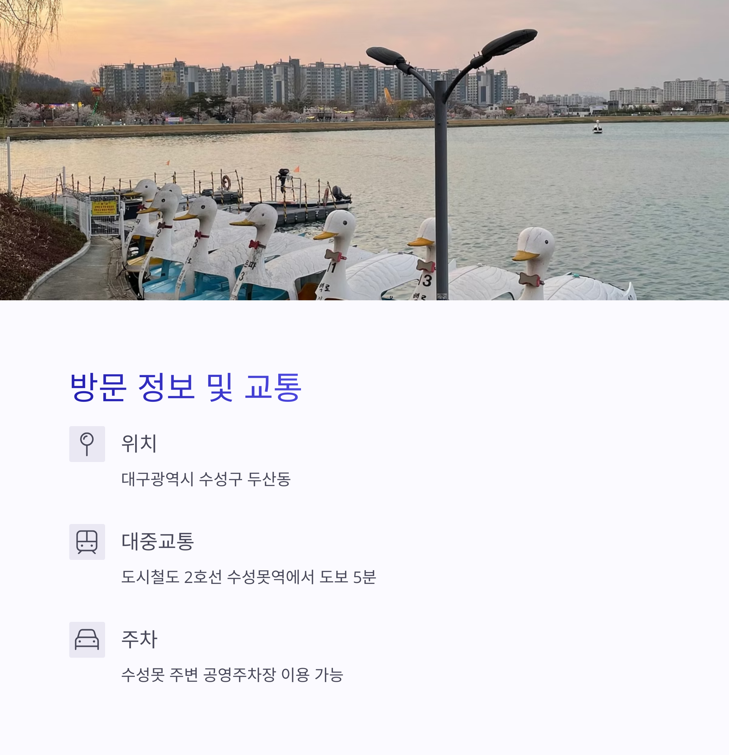 수성못 주변에는 공영주차장 및 인근 카페, 음식점 주차장이 잘 마련되어 있어 자가용 방문 시에도 편리하게 이용하실 수 있습니다.