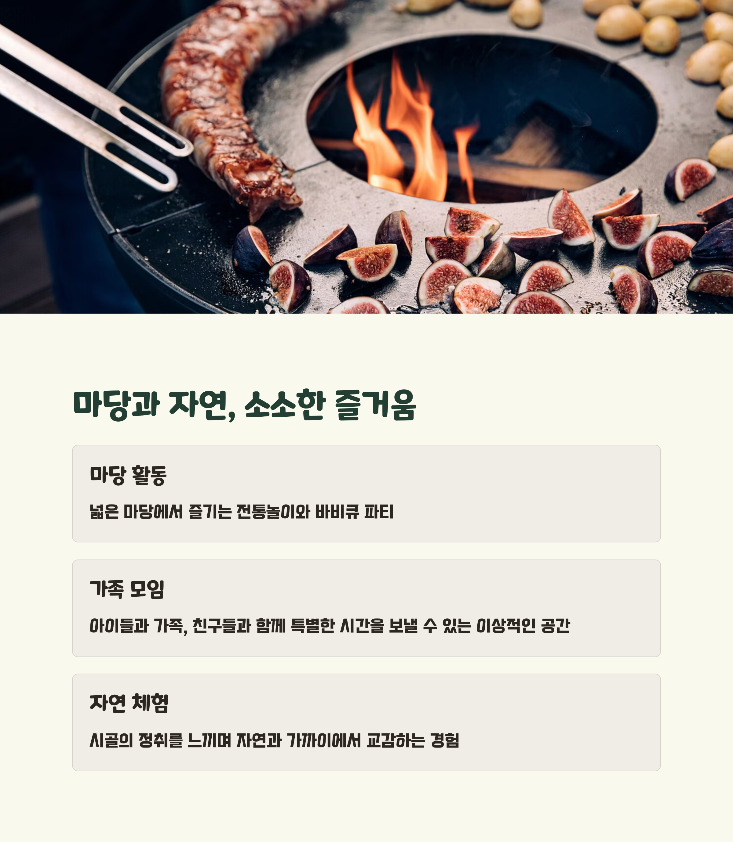 촌캉스 숙소 | 전통 한옥 또는 기와집, 시골 마당, 바비큐·전통놀이, 정겨운 분위기 |