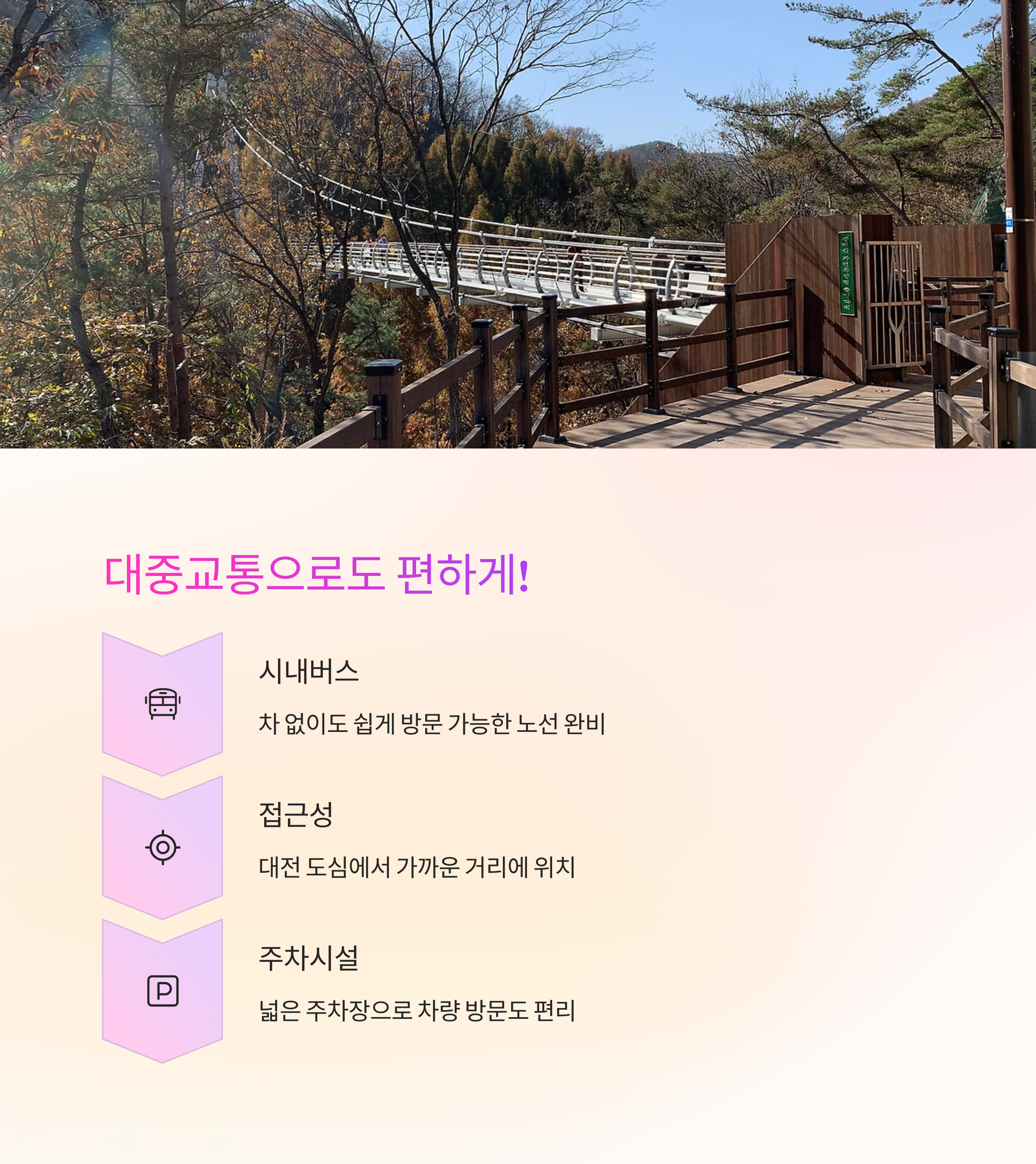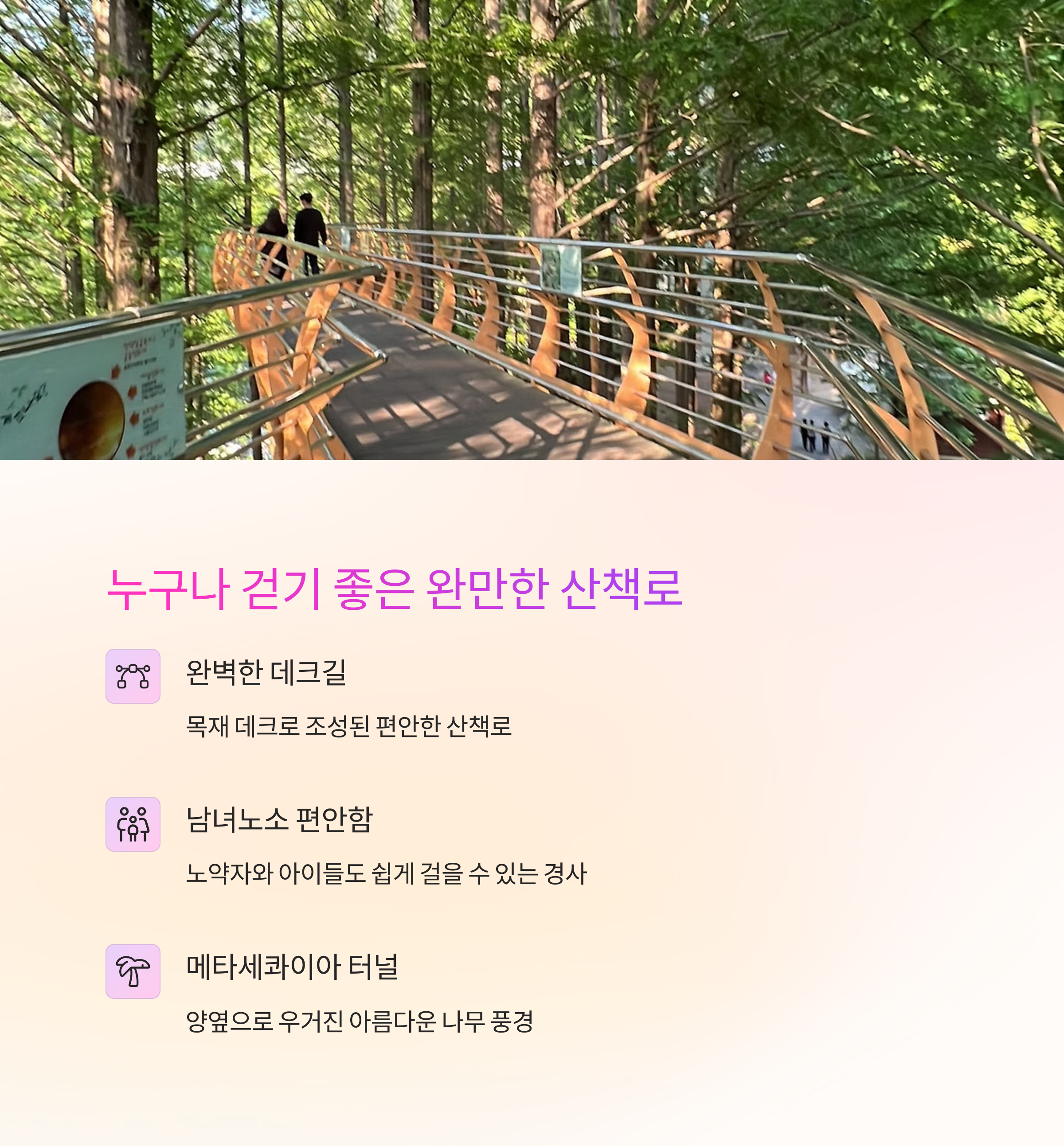 | 힐링 산책코스 | 데크길, 출렁다리, 전망대 등 다양한 동선 구성 |