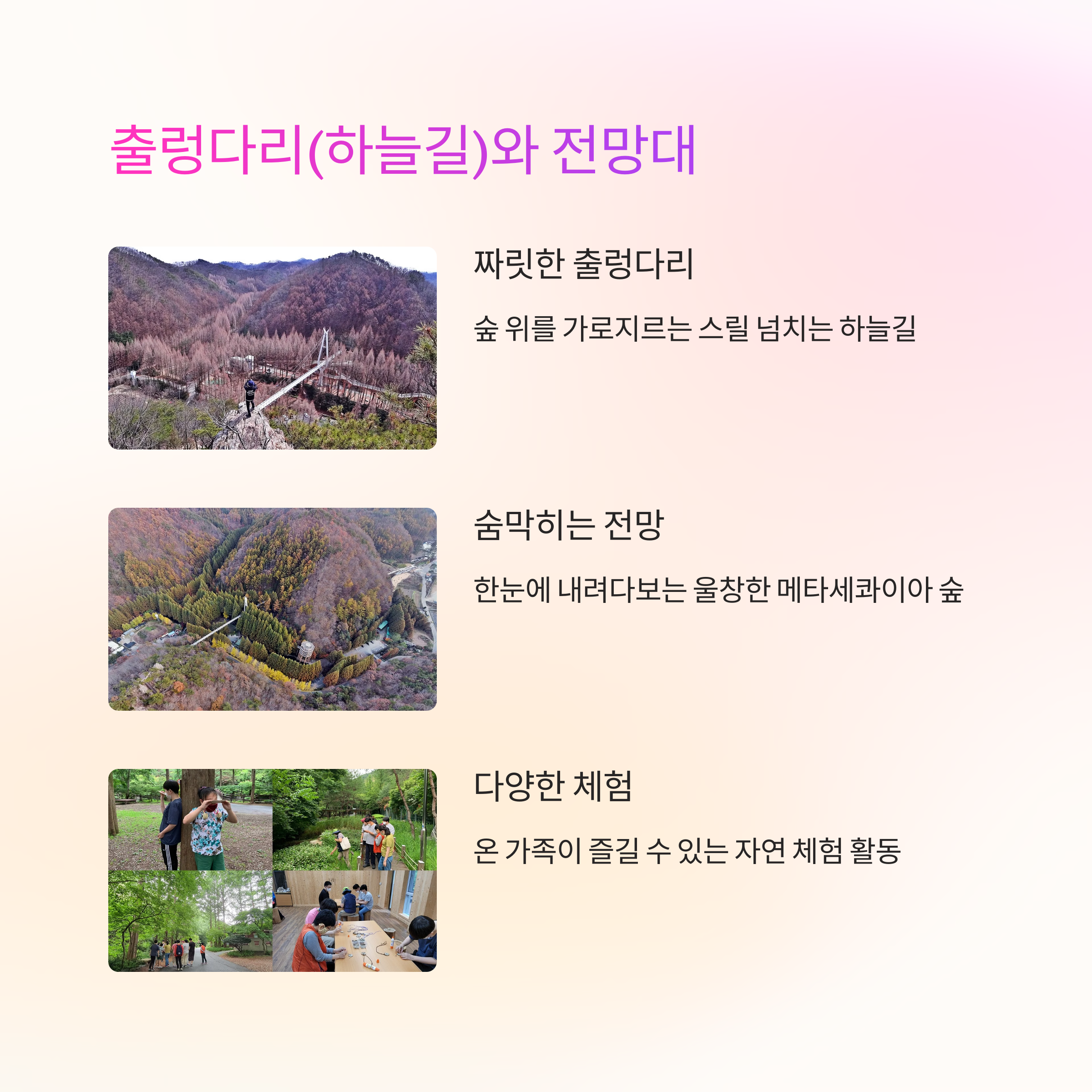 | 메타세콰이아길 | 하늘길 출렁다리 | 가족 힐링 장소 |