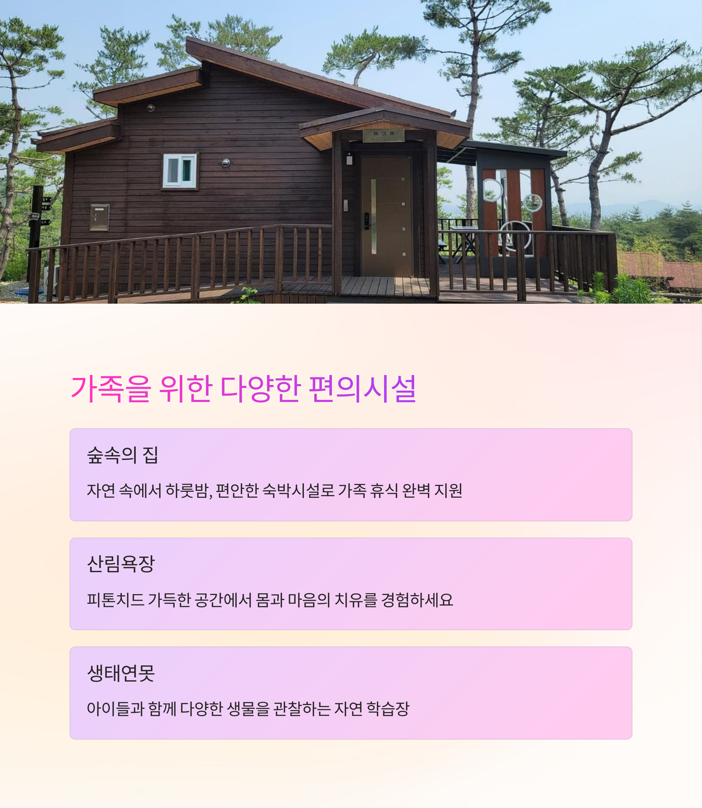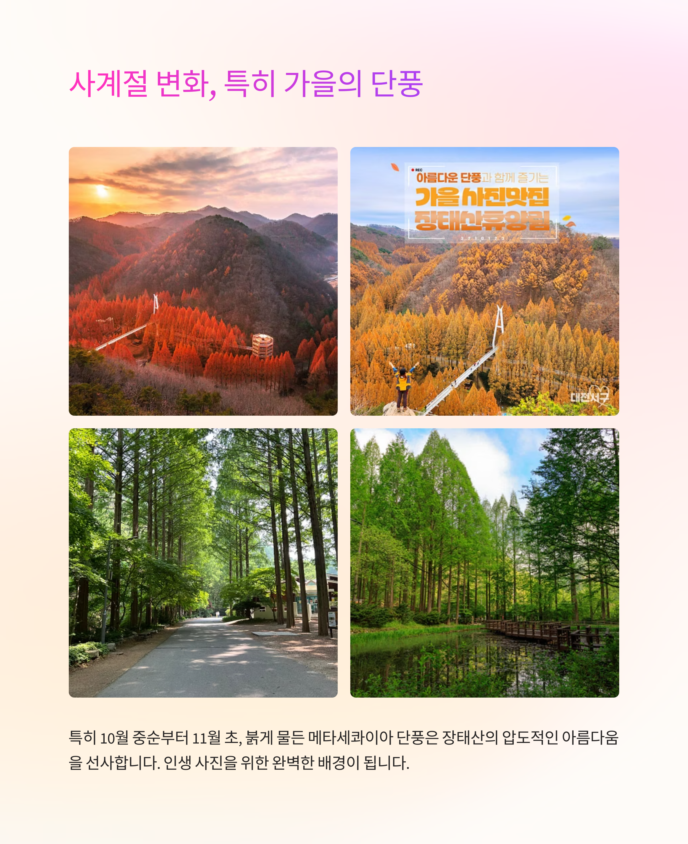 | 계절마다 다른 풍경과 사진 명소 | 다양한 코스와 함께 즐기는 숲의 정취 | 산림욕장, 생태연못 등 부대시설 완비 |