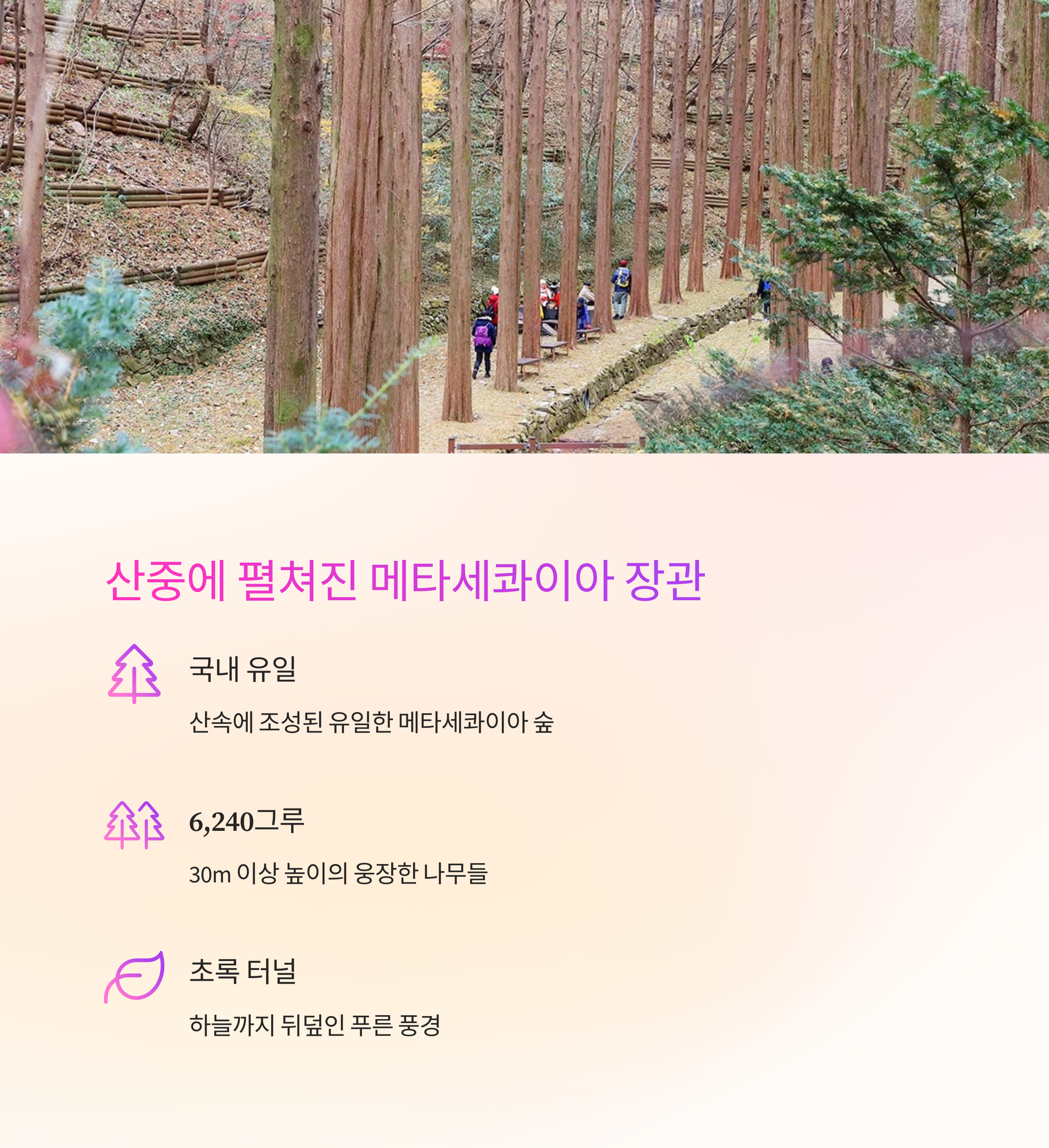 계절마다 다른 풍경과 사진 명소 다양한 코스와 함께 즐기는 숲의 정취 산림욕장, 생태연못 등 부대시설 완비
