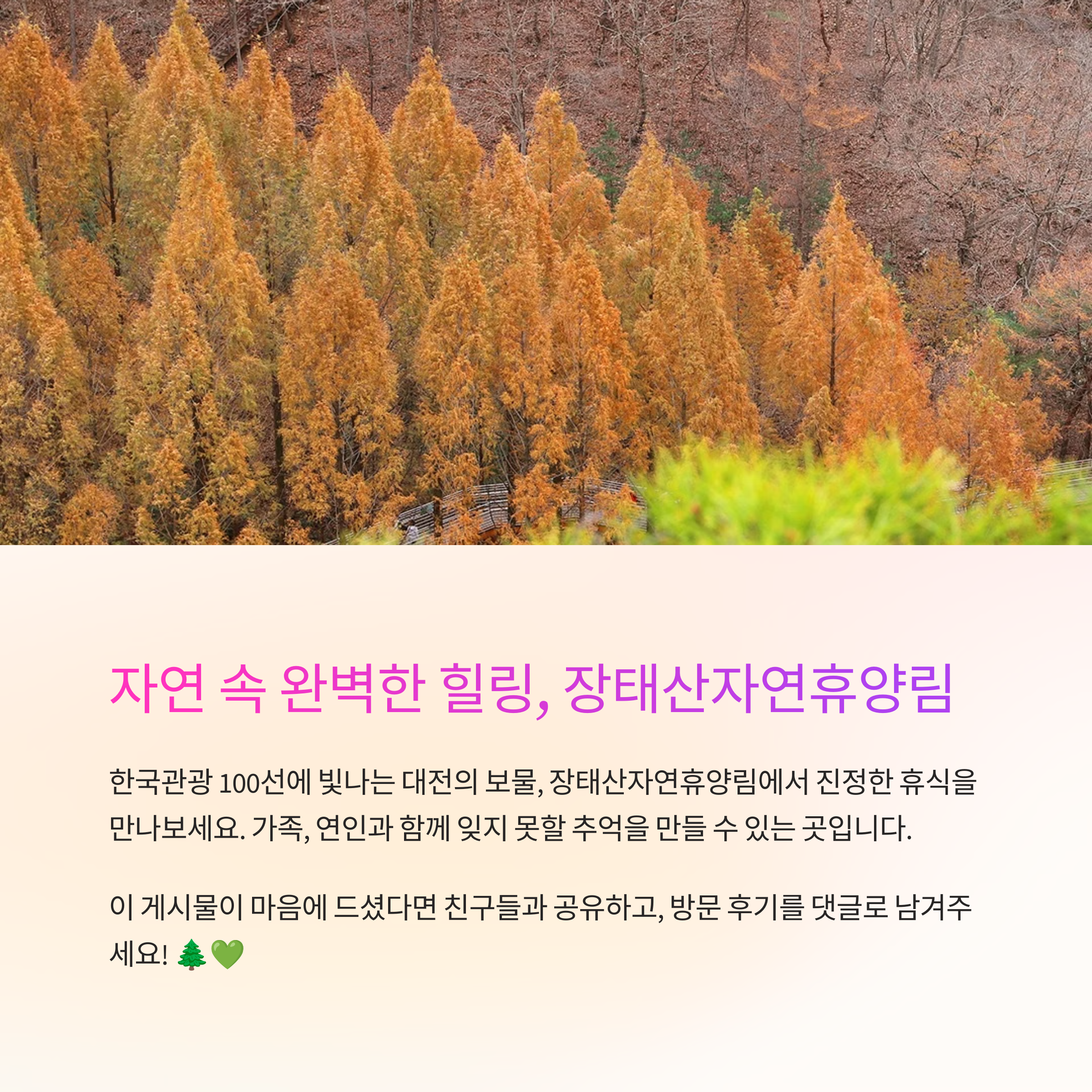장태산 자연휴양림을 다녀오신 경험이 있으신가요? 또는 가보고 싶은 마음이 드셨다면 어떤 부분이 가장 기대되시나요? 여러분의 소중한 이야기를 댓글로 남겨주세요!