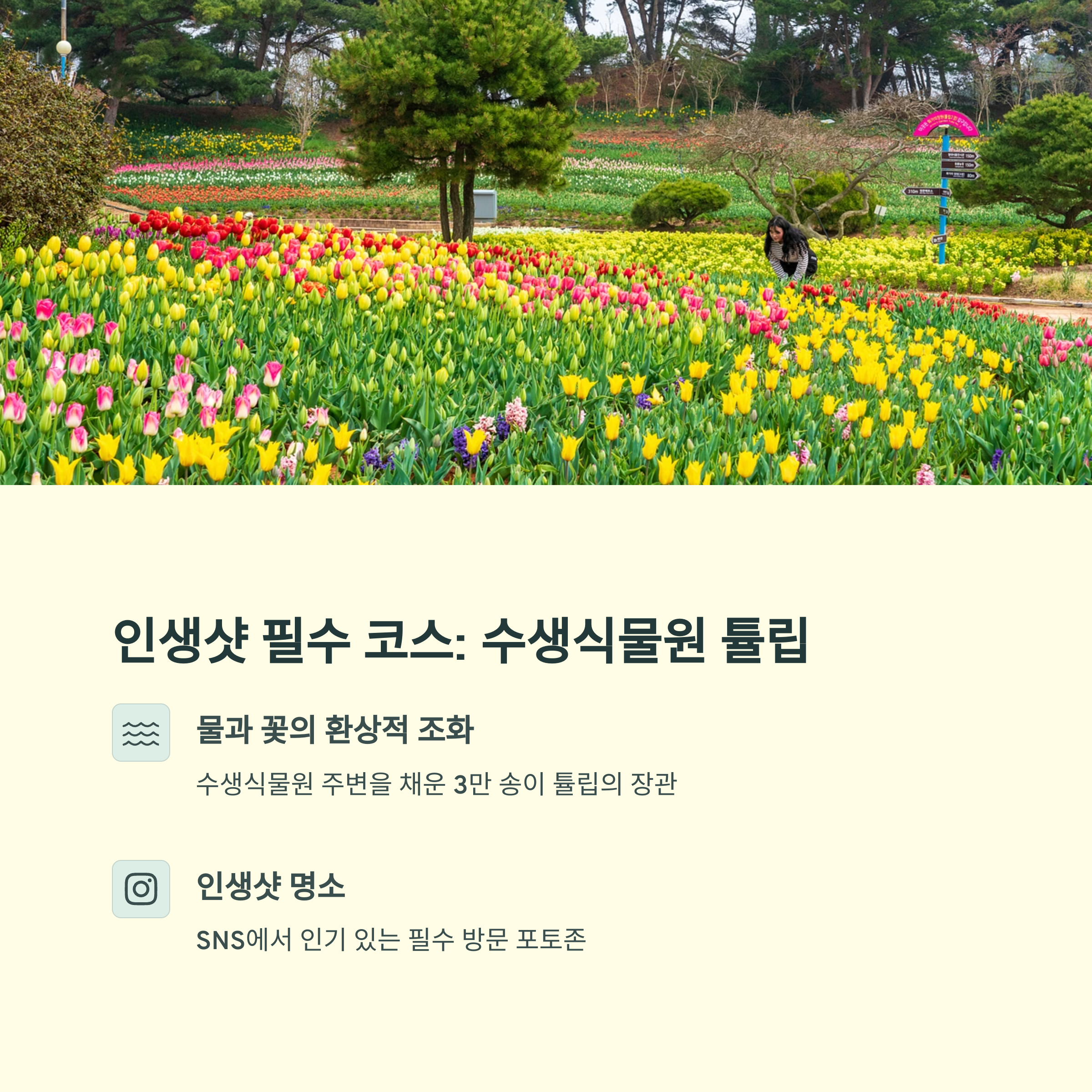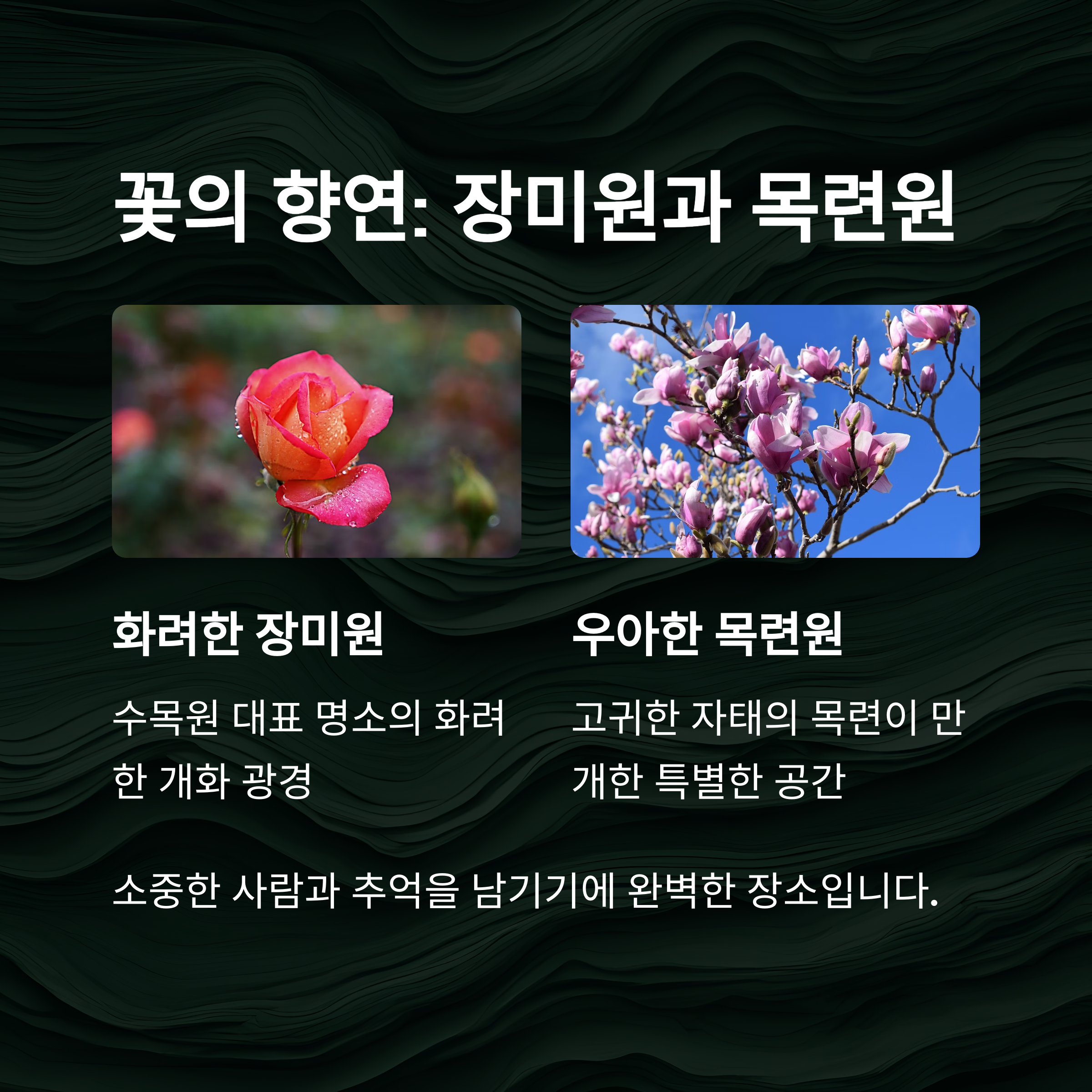 | 추천 감상 포인트 | 수생식물원 튤립, 장미원, 야경 산책로, 클레마티스 전시장 |