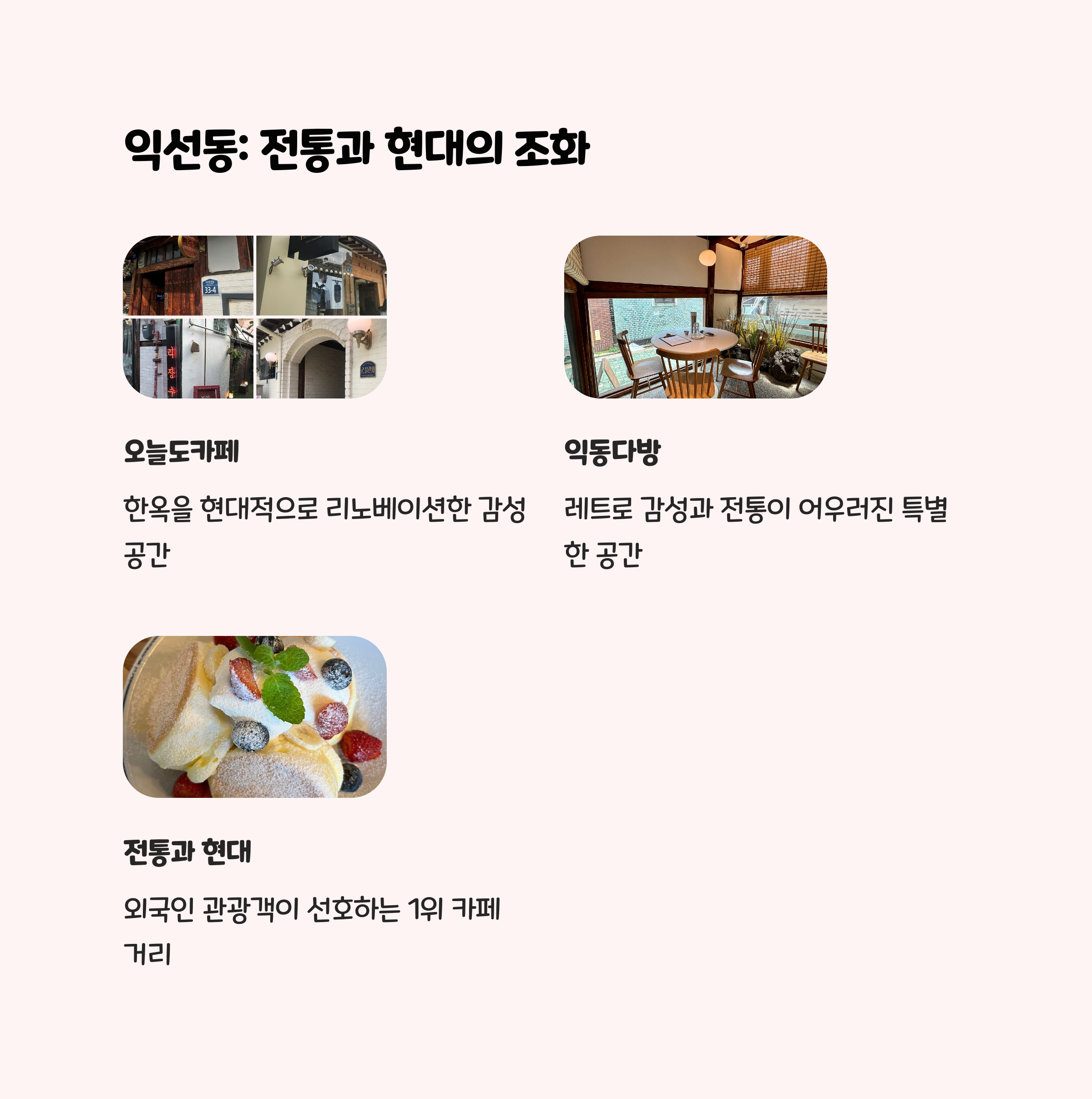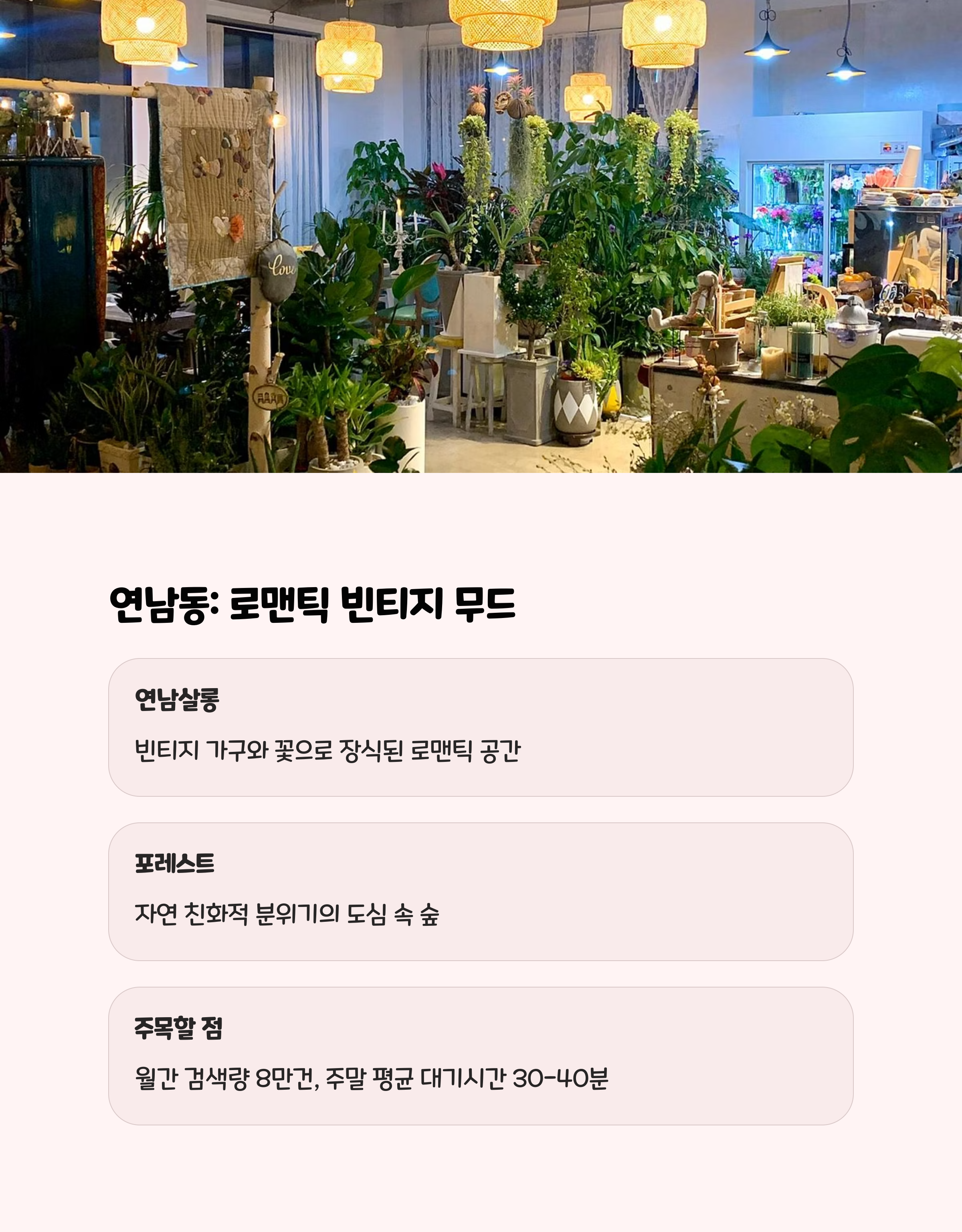 연남동은 빈티지한 감성과 로맨틱한 분위기의 카페가 가득한 동네입니다. 플라워 데코와 아기자기한 가구가 어우러진 ‘연남살롱’, 숲속처럼 꾸며진 ‘포레스트’ 등은 걷기 좋은 골목들과 어우러져 데이트 코스로도 최적입니다. 익선동은 한옥을 개조한 ‘오늘도카페’, ‘익동다방’ 등 전통과 현대가 공존하는 분위기로 인기를 끌고 있습니다.