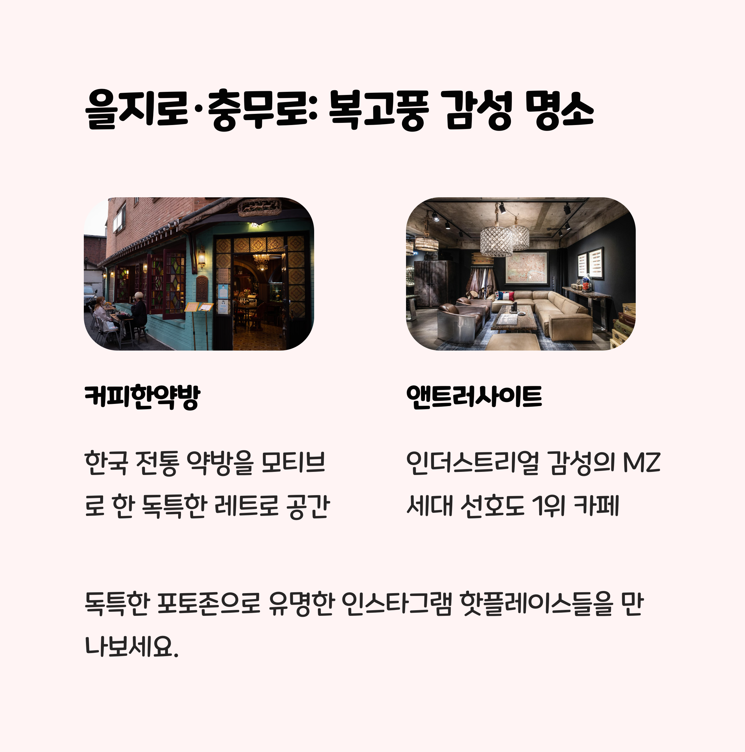 연남동은 빈티지한 감성과 로맨틱한 분위기의 카페가 가득한 동네입니다. 플라워 데코와 아기자기한 가구가 어우러진 ‘연남살롱’, 숲속처럼 꾸며진 ‘포레스트’ 등은 걷기 좋은 골목들과 어우러져 데이트 코스로도 최적입니다. 익선동은 한옥을 개조한 ‘오늘도카페’, ‘익동다방’ 등 전통과 현대가 공존하는 분위기로 인기를 끌고 있습니다.