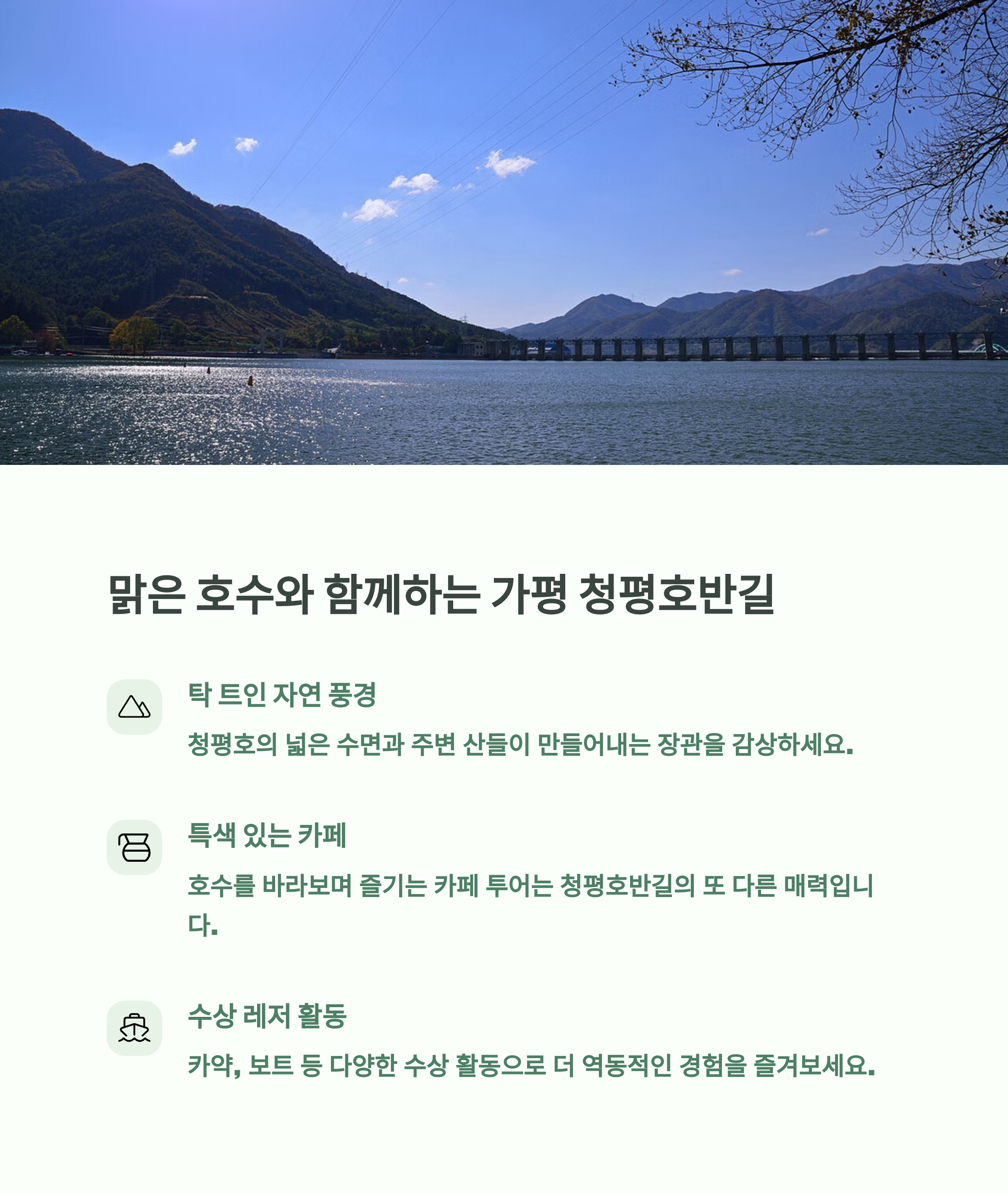 남양주, 가평, 춘천 등 강변 따라 감성 드라이브 추천 호수뷰 카페, 산책길, 피크닉존 정보까지 함께 소개 남한산성, 대부도, 두물머리 등 역사·자연 어우러진 장소