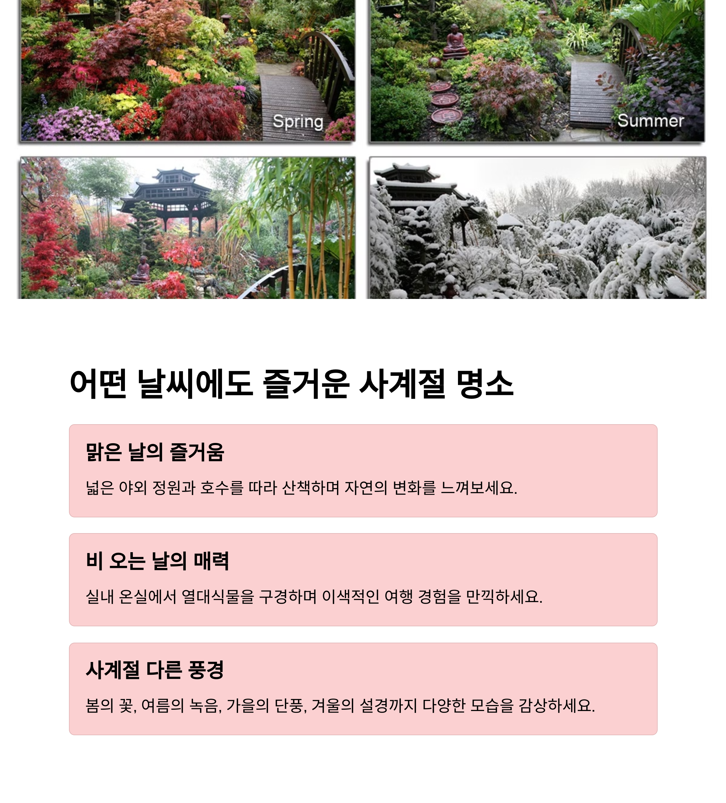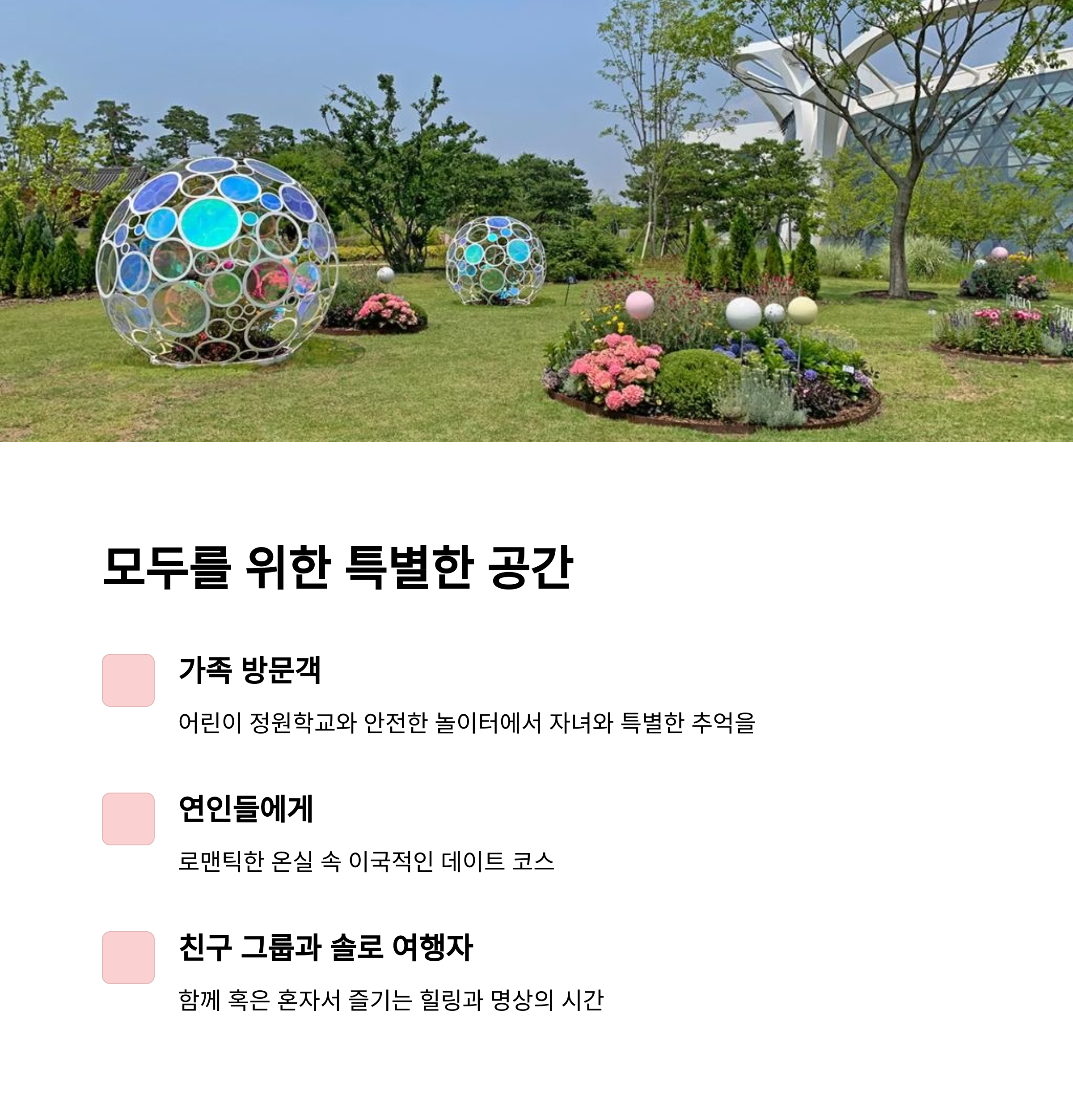 | 열대관, 지중해관 등 세계 식물 감상이 가능한 실내 전시존 | 호수 산책, 숲 체험, 습지탐방로까지 다양한 코스 | 날씨에 상관없이 사계절 나들이 가능해요! |