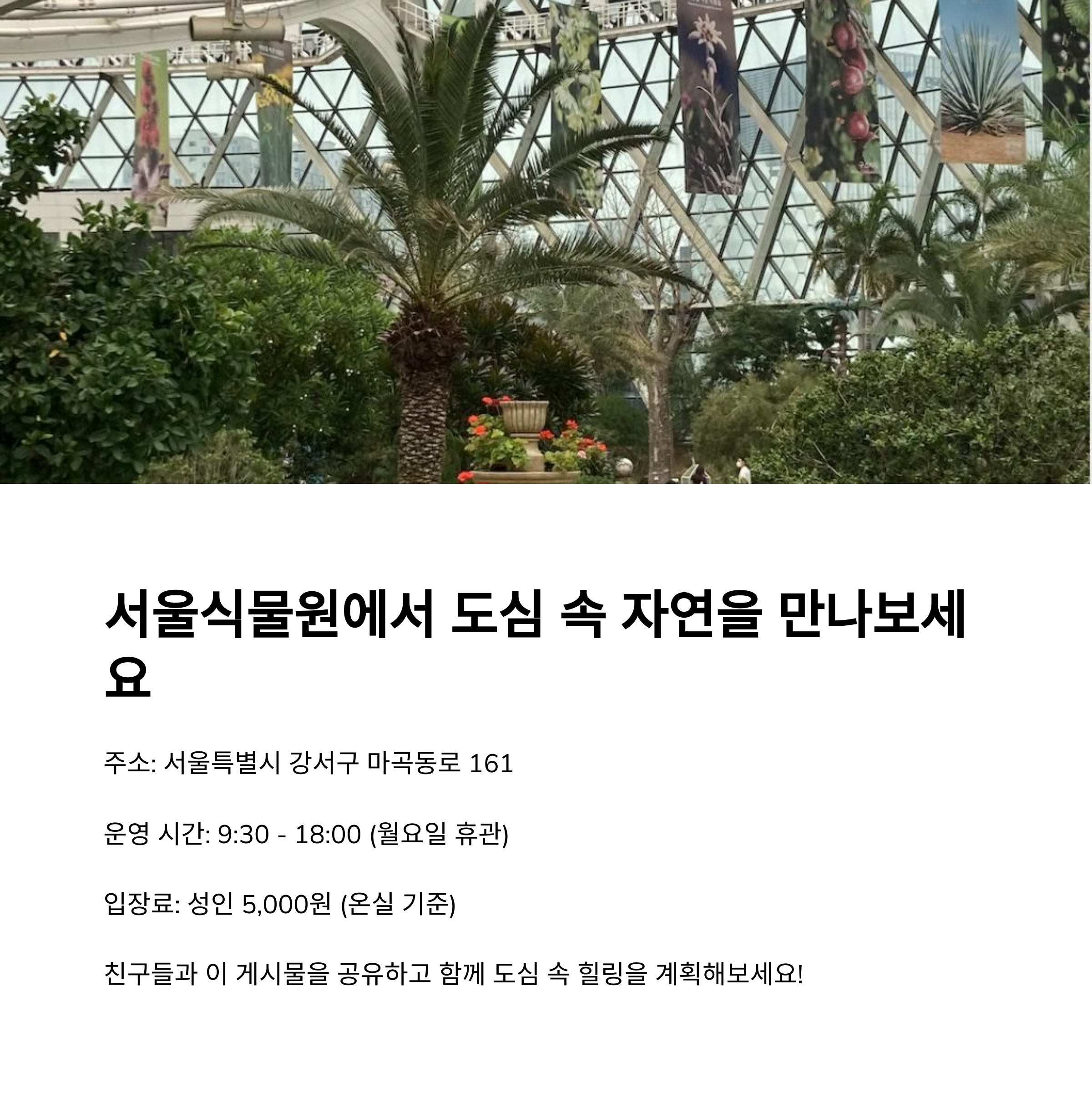서울식물원 외에도 좋아하는 실내 정원이나 식물원, 힐링 명소가 있다면 댓글로 공유해주세요! 소소한 쉼표가 누군가에게 큰 위로가 될 수 있답니다 💚