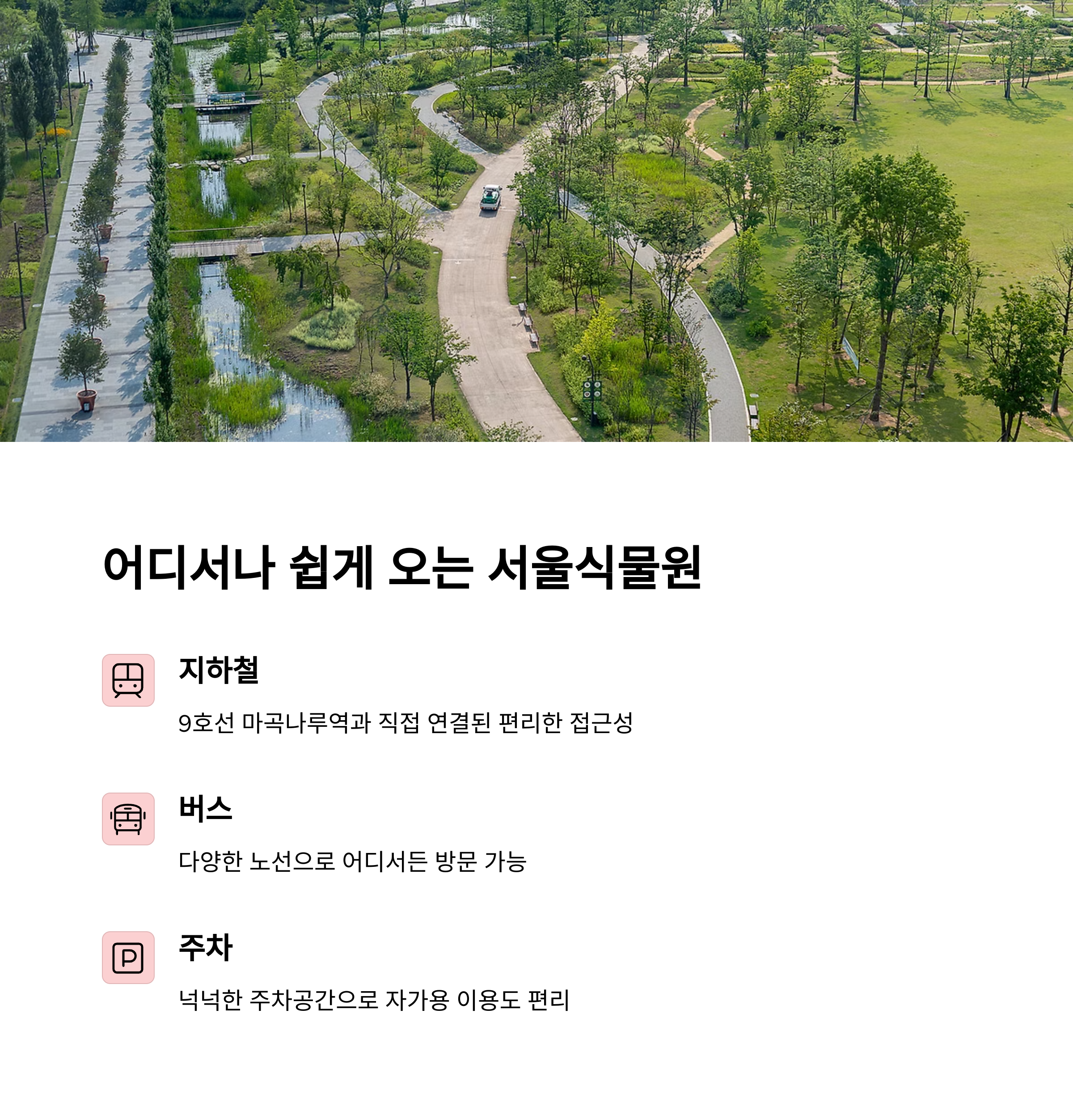 서울식물원은 지하철 9호선 마곡나루역과 바로 연결돼 있어 대중교통으로도 편하게 방문할 수 있어요. 비 오는 날에는 온실에서, 맑은 날에는 호수원과 숲길에서 날씨에 따라 맞춤형 힐링이 가능한 공간이에요. 도시의 일상에 지쳤을 때, 자연으로 숨쉴 수 있는 공간을 찾는다면 이곳만한 곳이 없답니다.