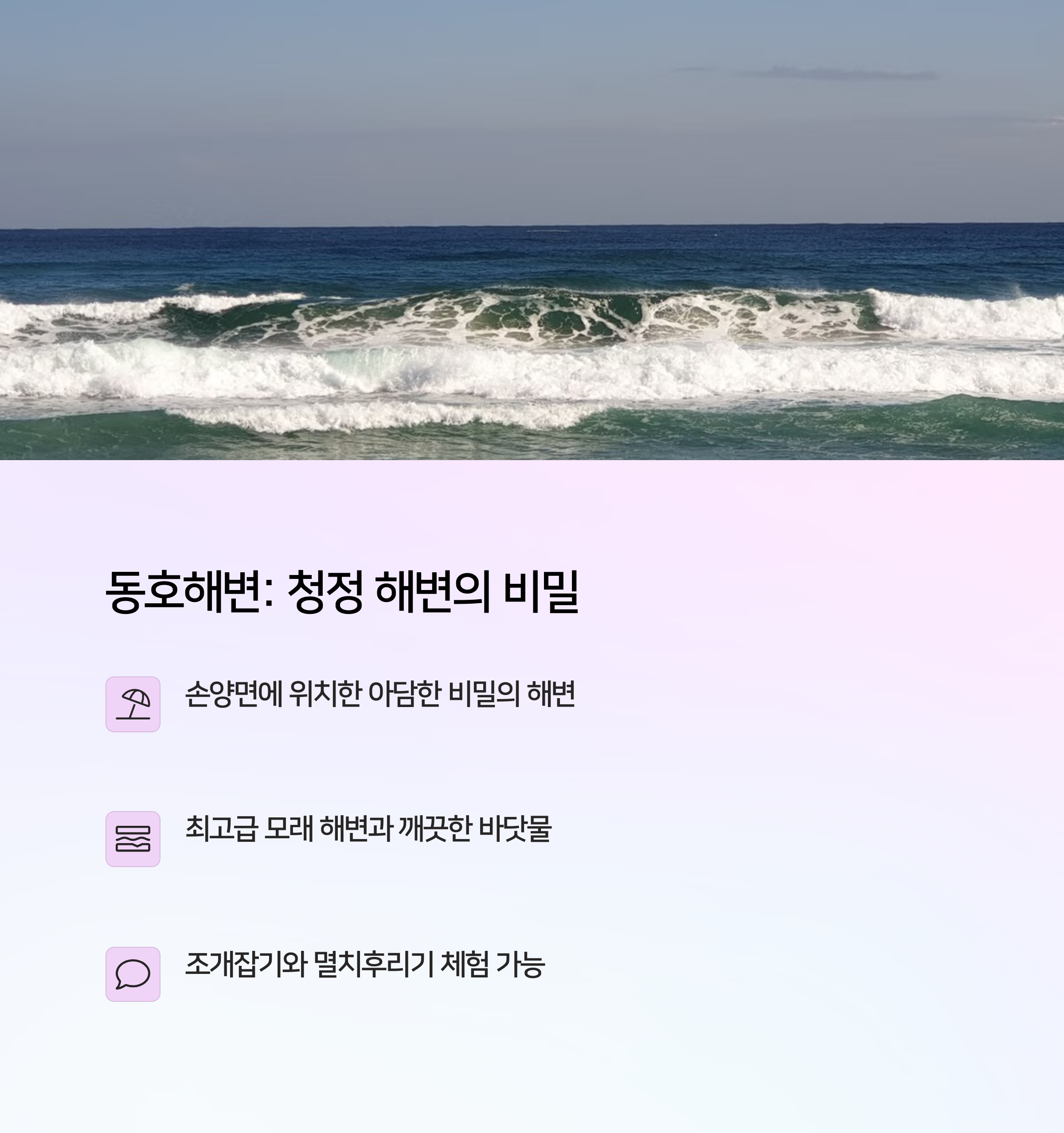 | 사람 적은 감성 해변으로 인기 상승 중 | SNS 인기 스팟으로 사진 촬영하기 좋음 | 남녀노소 누구에게나 추천할 수 있는 명소 |