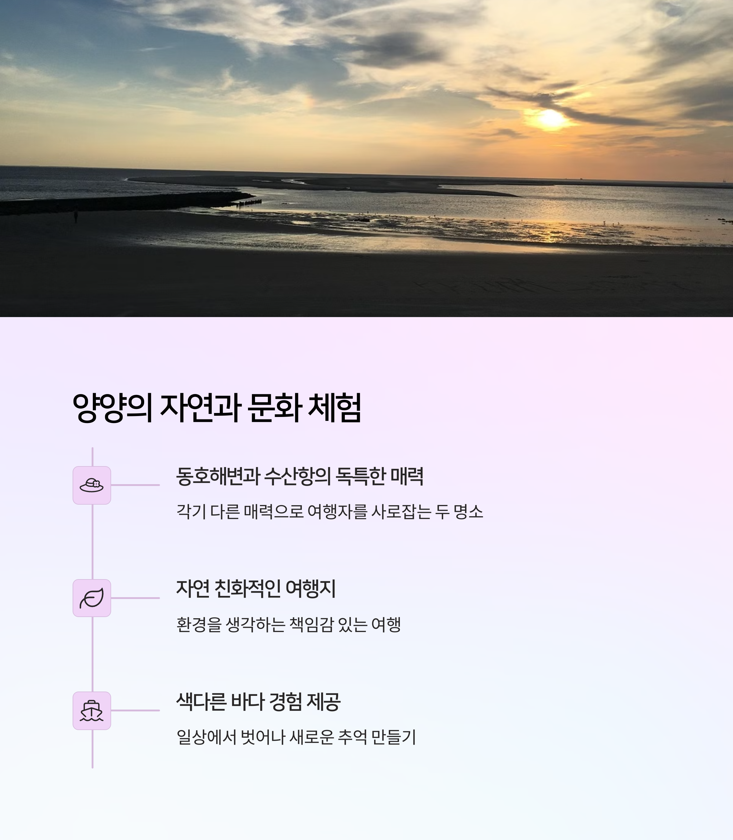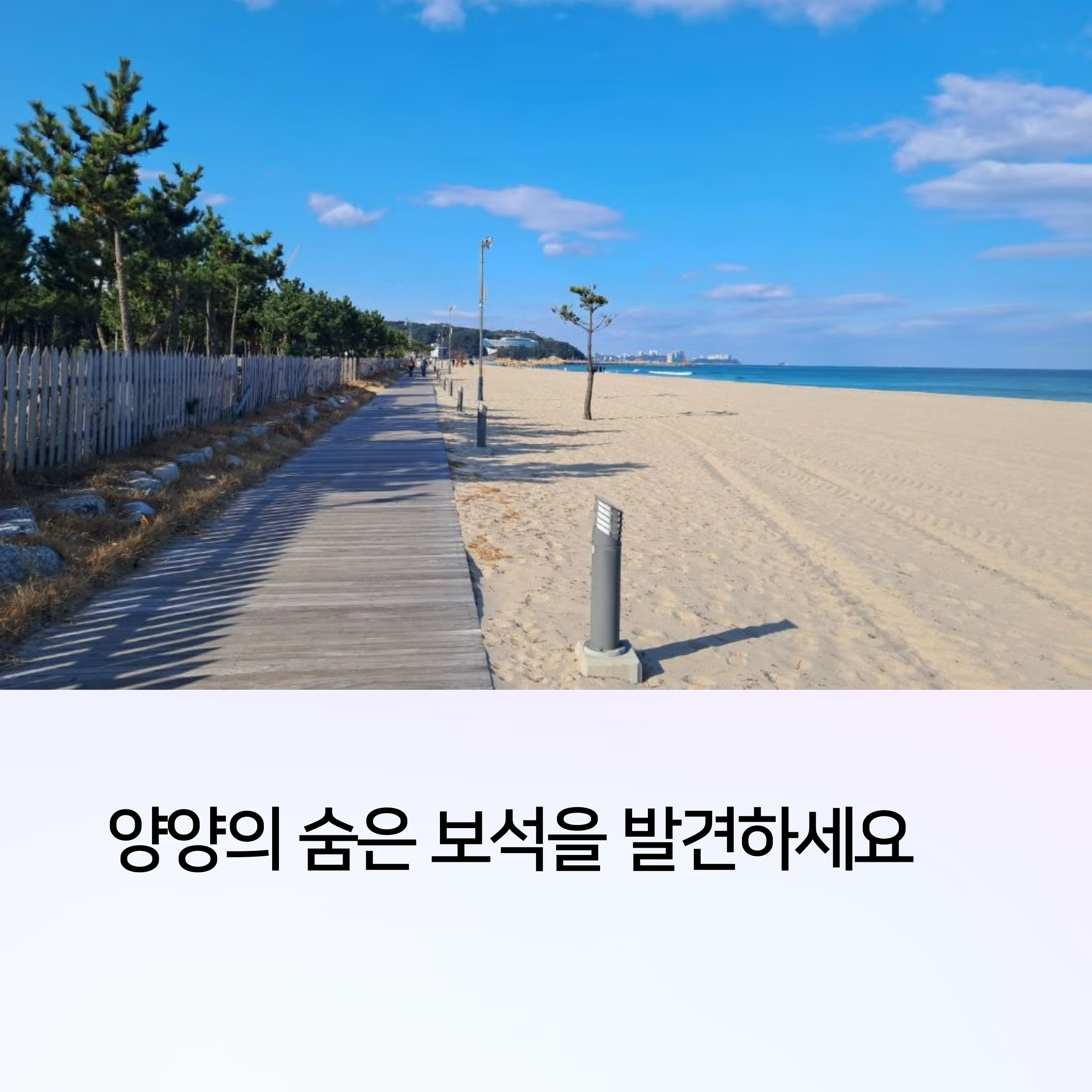양양의 대표적인 명소 외에도 이렇게 감성과 체험이 어우러진 숨겨진 장소들이 있다는 것은 여행의 묘미를 더해줍니다. 동호해변의 고요한 자연 속에서 조용한 시간을 보내고, 수산항에서 해양 체험과 이국적인 산책을 함께 즐긴다면 여행은 한층 더 풍성해질 것입니다. 자연 그대로의 모습을 간직한 이 명소들은 힐링과 여유를 찾는 여행자들에게 특별한 추억을 선물할 것입니다.