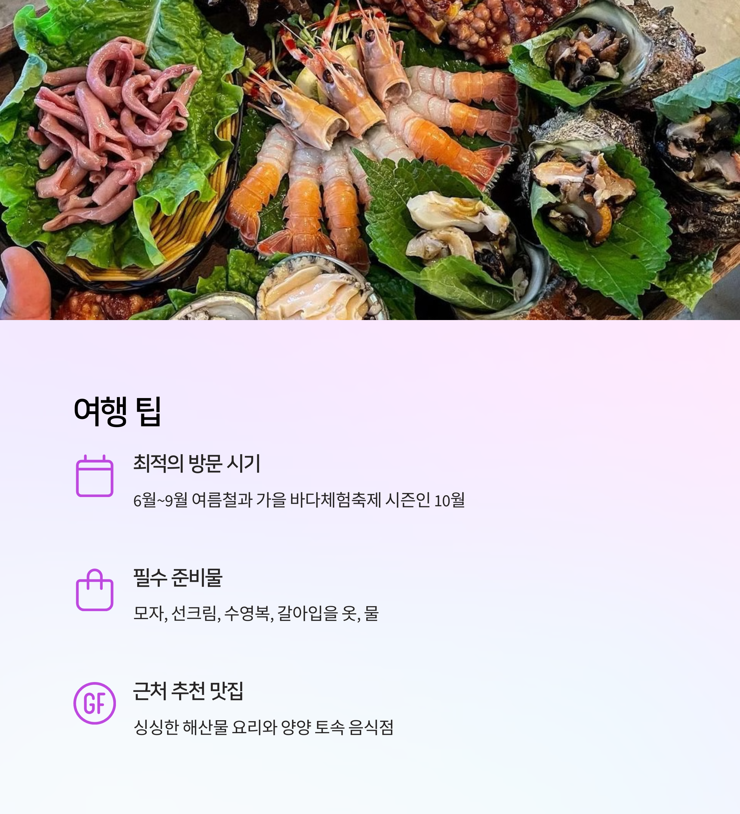 | 청정 해변, 조개잡이와 멸치후리기 체험 가능 | 요트 마리나와 낚시, 해양 체험 프로그램 운영 | 가을축제, 여유로운 산책과 포토존 즐기기 |