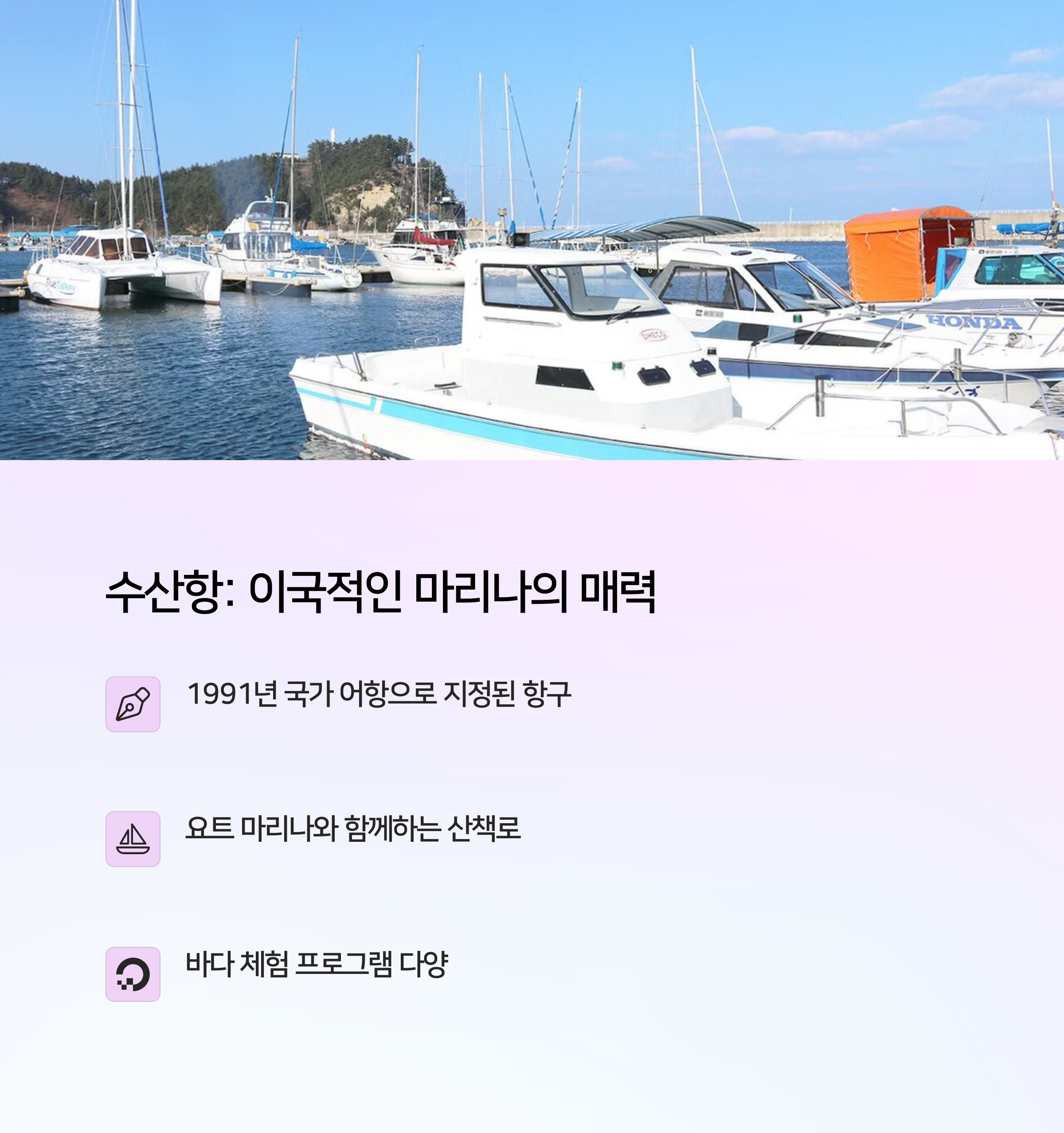 | 수산항 매력 | 요트 마리나, 낚시, 바다체험축제로 풍성한 볼거리 |
