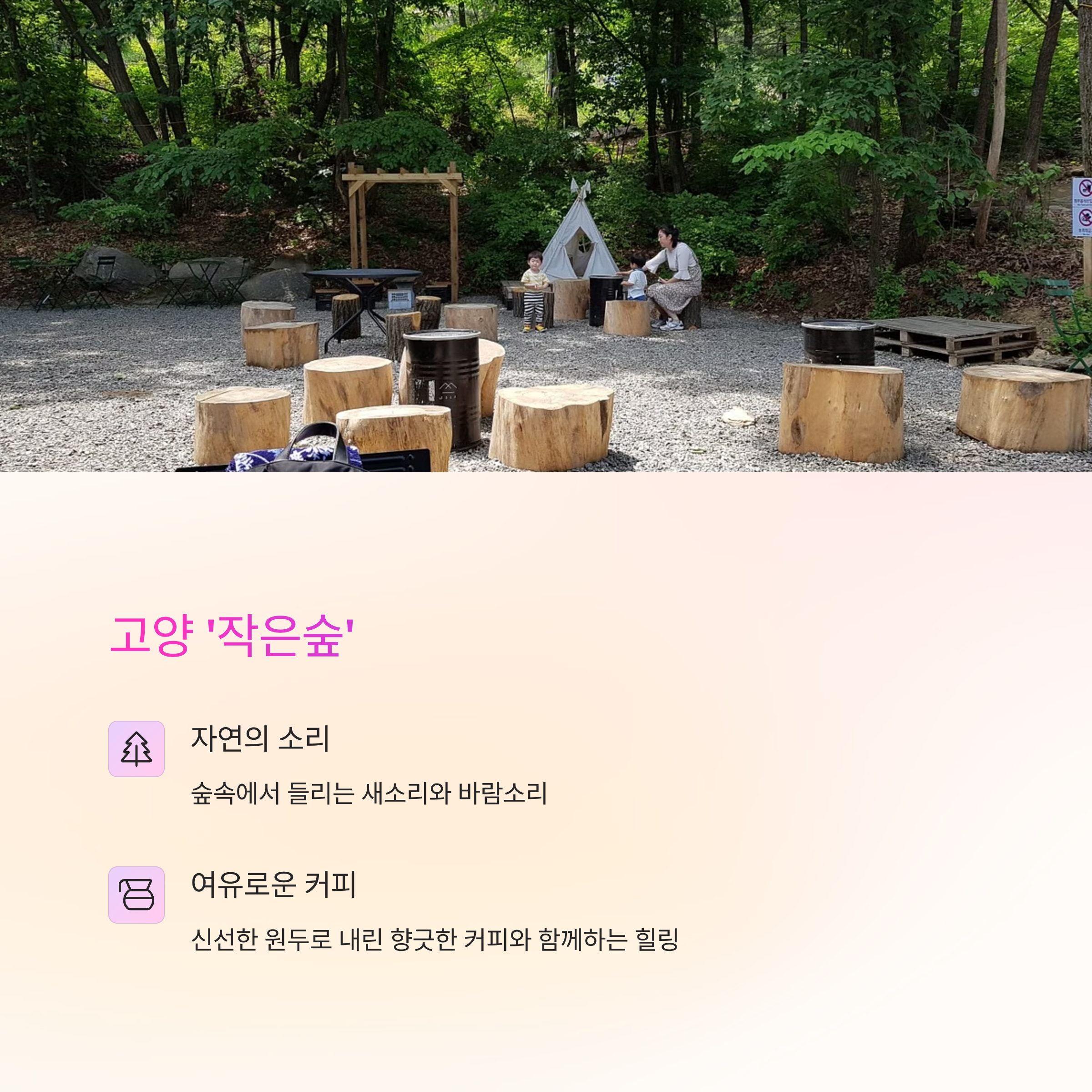 | 커피+전시+자연 풍경까지 한 번에 즐기기 좋아요 | 연인·가족·혼자 모두 편안하게 머물 수 있는 공간 | 계절마다 다른 매력, 봄부터 가을까지 꾸준히 인기! |