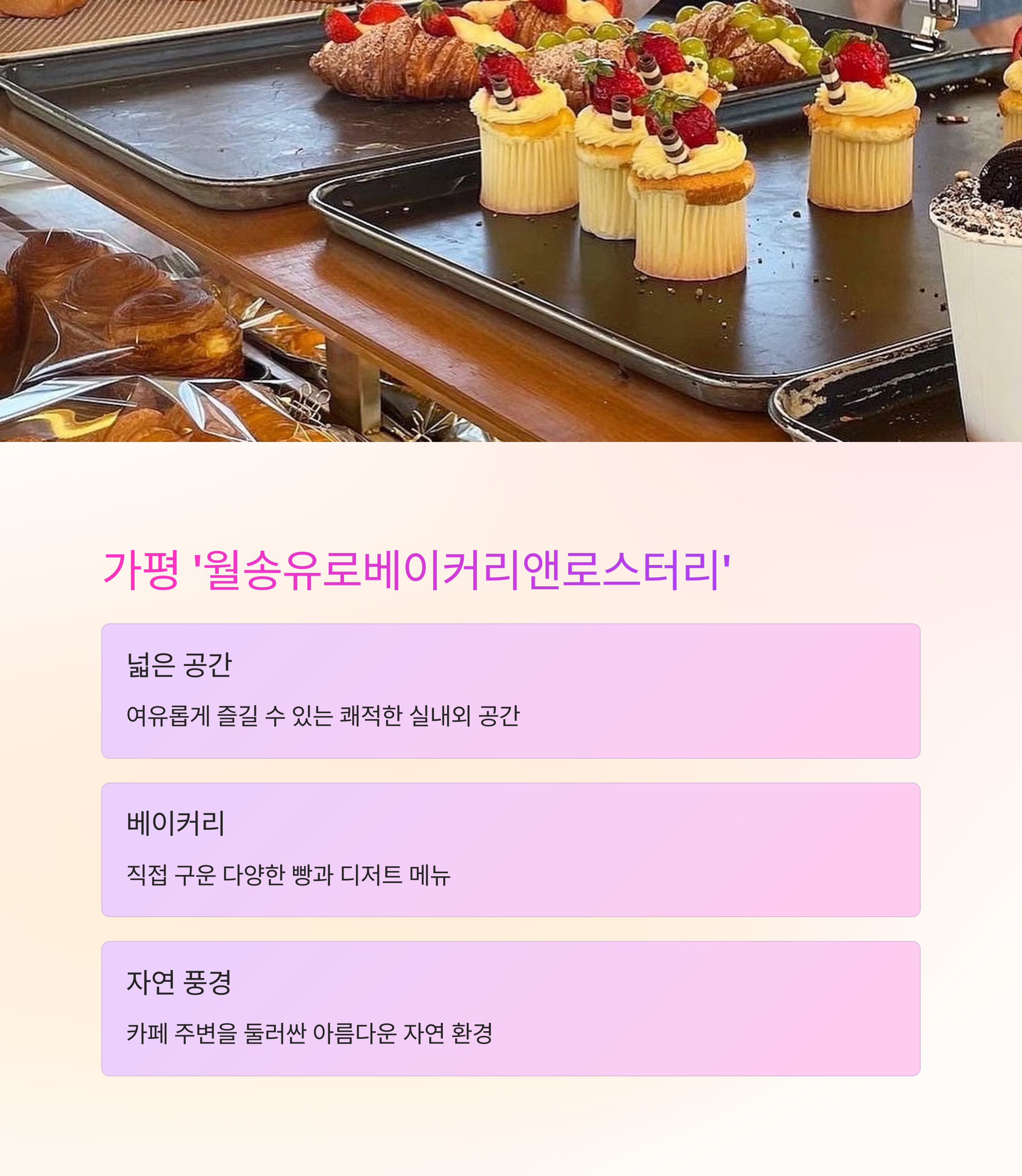 | 감성 포토존 & 공간미 | 미디어아트, 베이커리, 테라스 뷰 등 다양한 테마로 눈과 입을 모두 사로잡아요. |