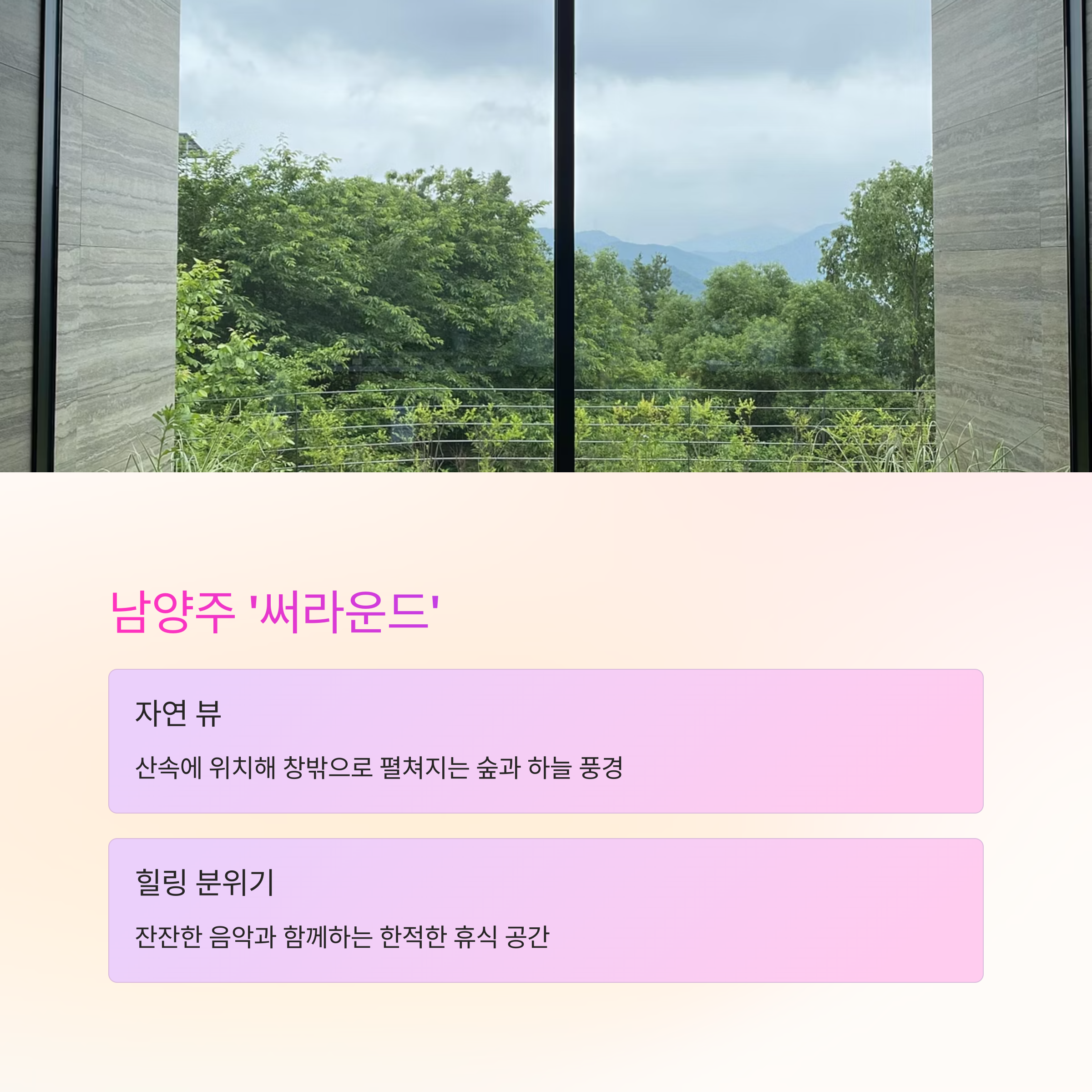 | 자연 힐링 뷰 | 남양주·고양·성남 등 숲, 호수, 산이 어우러진 한적한 카페들이 가득해요. |