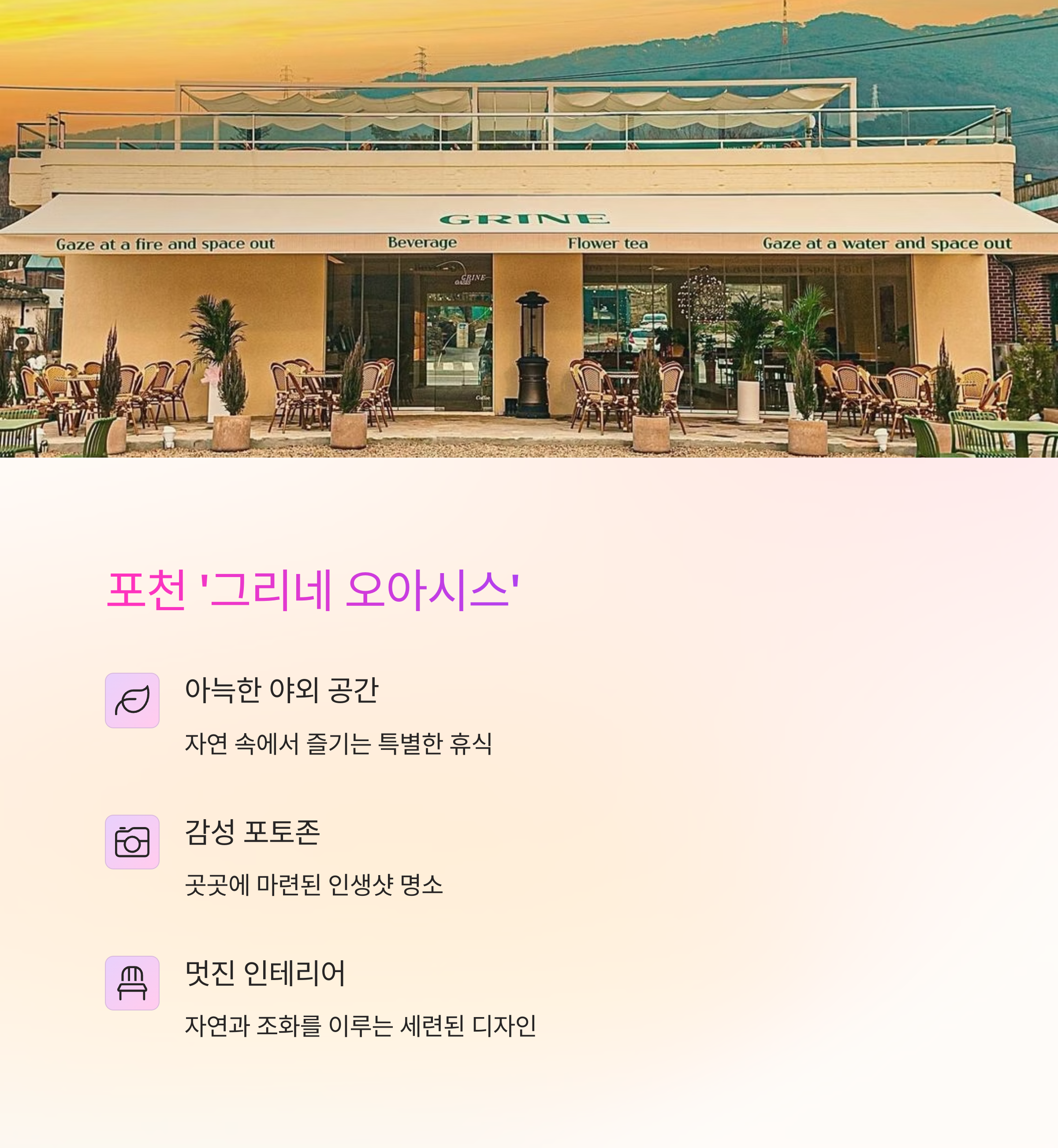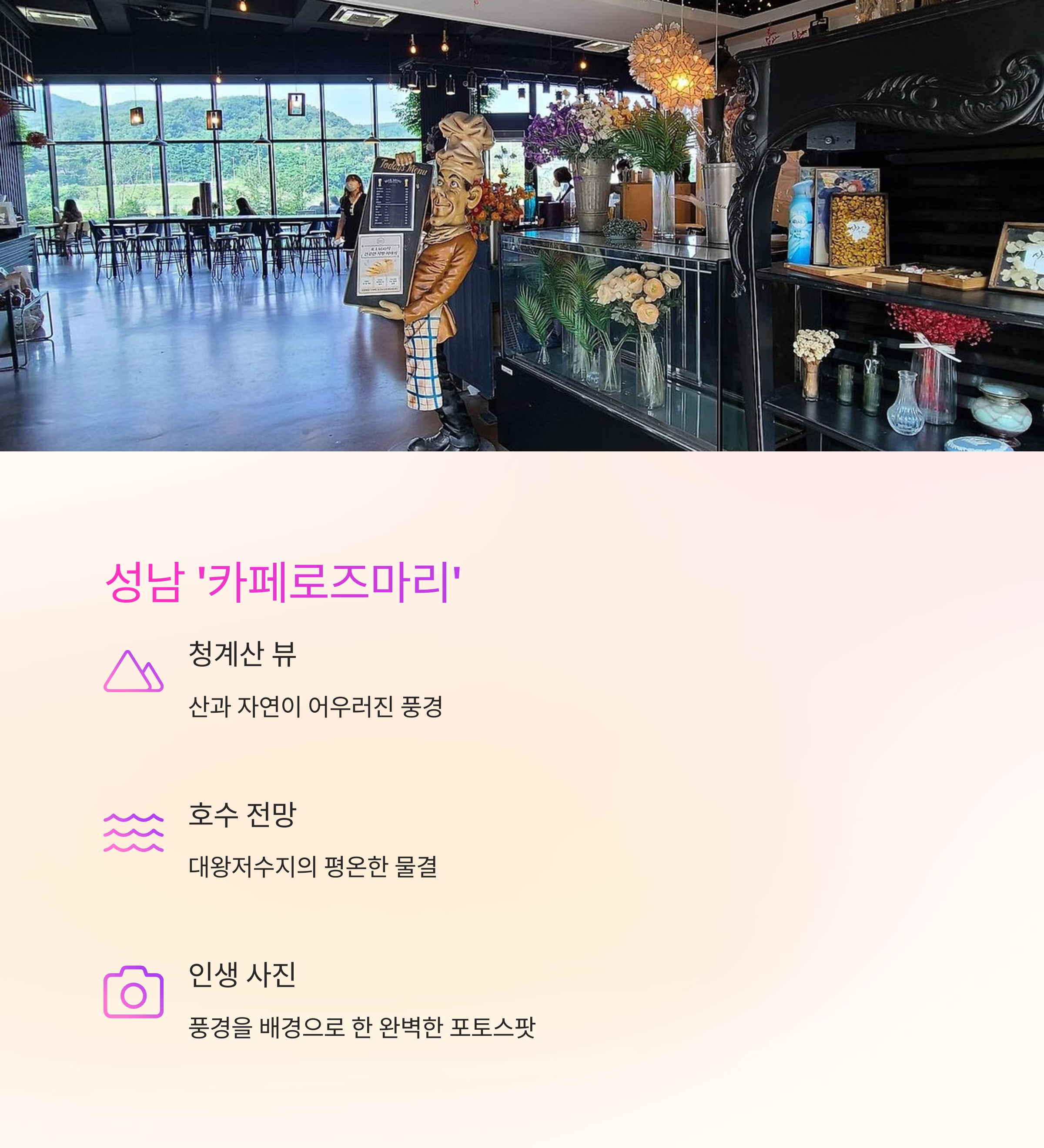 | 감성 포토존 & 공간미 | 미디어아트, 베이커리, 테라스 뷰 등 다양한 테마로 눈과 입을 모두 사로잡아요. |