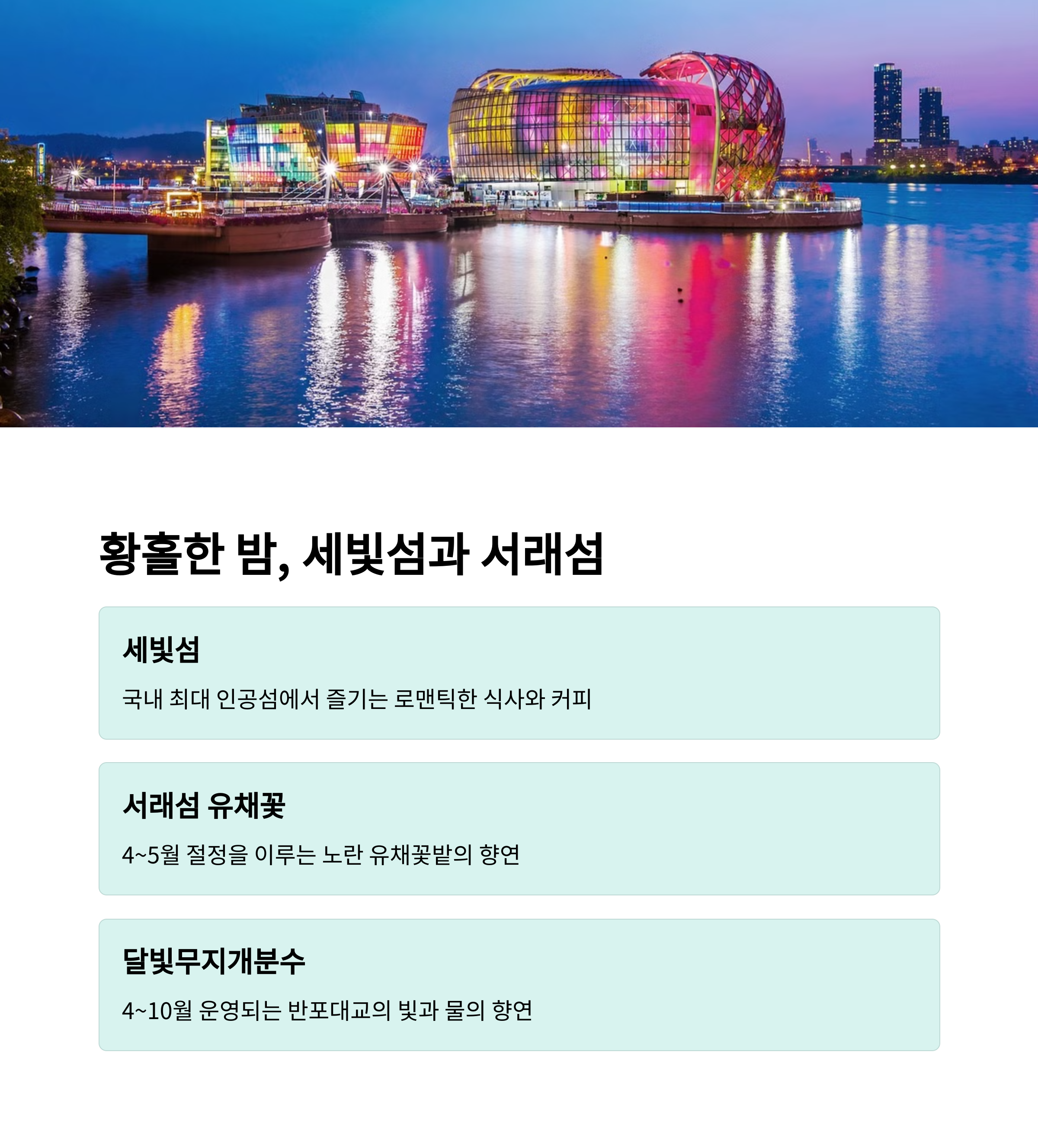 | 반포, 세빛섬, 서래섬, 유채꽃 명소 | 나비정원, 꽃사슴, 식물원 체험 | 성수동 카페거리, 저녁 데이트 |