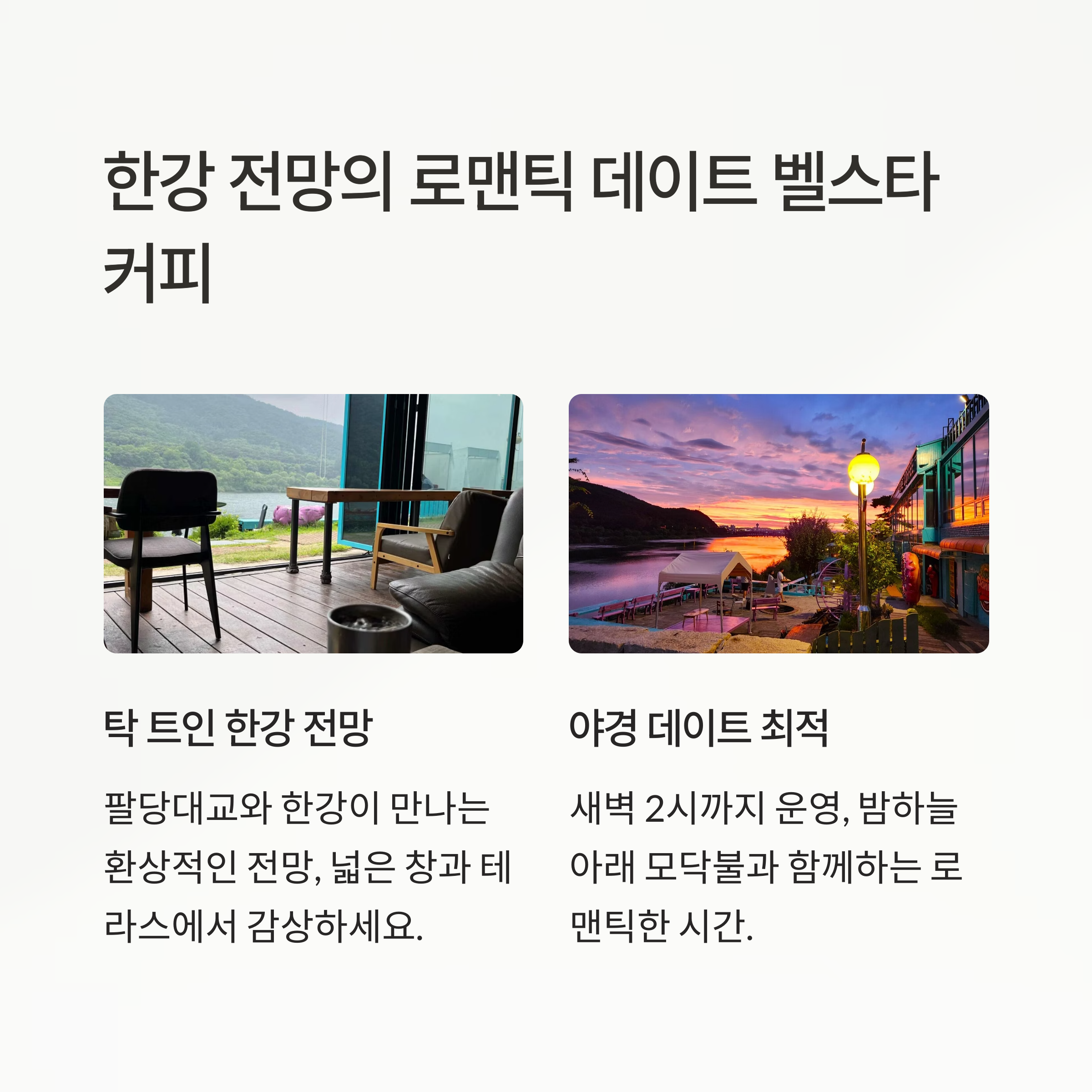 남양주 팔당대교 인근 ‘벨스타커피’는 넓은 유리창과 테라스를 통해 한강 전망과 야경을 감상할 수 있는 곳으로 감성적인 드라이브 데이트 코스로 추천돼요. 내부는 모던하고 세련된 분위기이며, 야외 테라스에서 커피를 마시며 한강을 바라보는 순간이 특히 낭만적으로 느껴집니다. 주차장도 넓어 차량 이용이 편리하고, 일몰 타이밍 방문도 강력 추천!