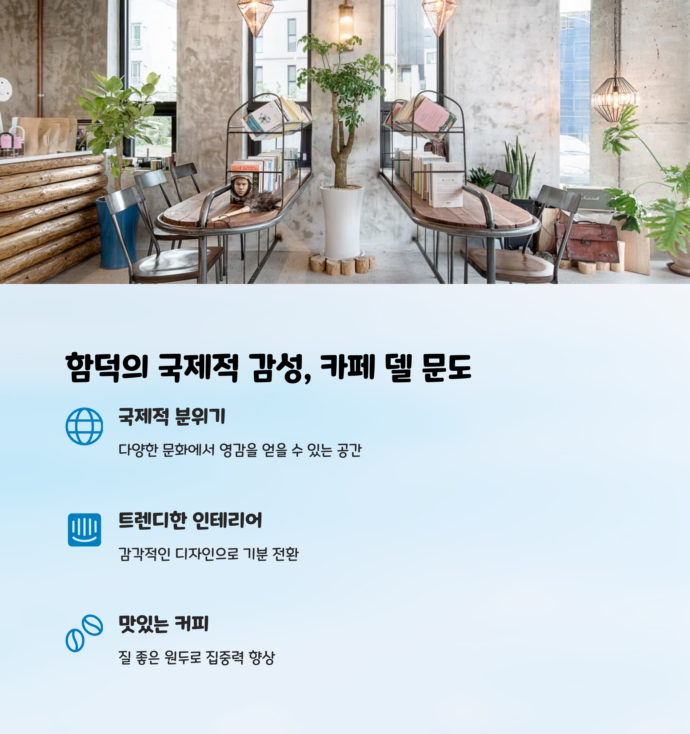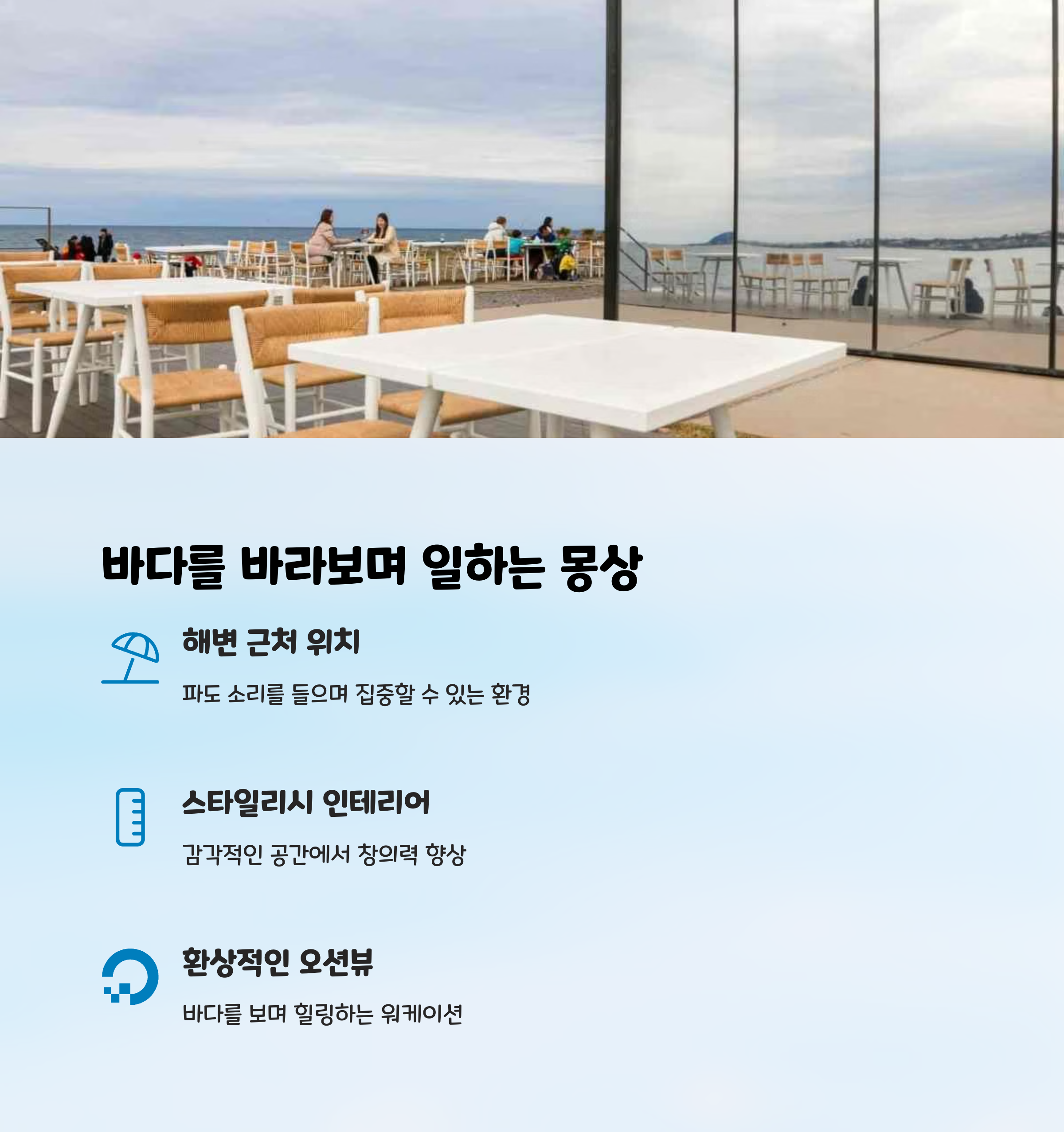 | 바다·해변과 가까운 위치 | 전원 사용 가능, 넓은 좌석 간격 | 혼자 일하기 좋은 카페 분위기 |