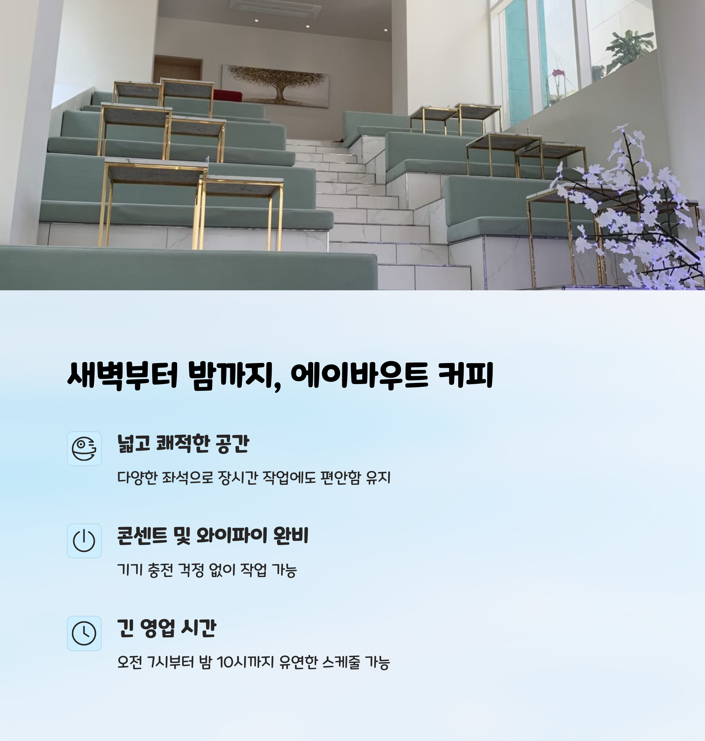 | 추천 조건 | 조용한 분위기 + 빠른 와이파이 + 전원 이용 가능 |