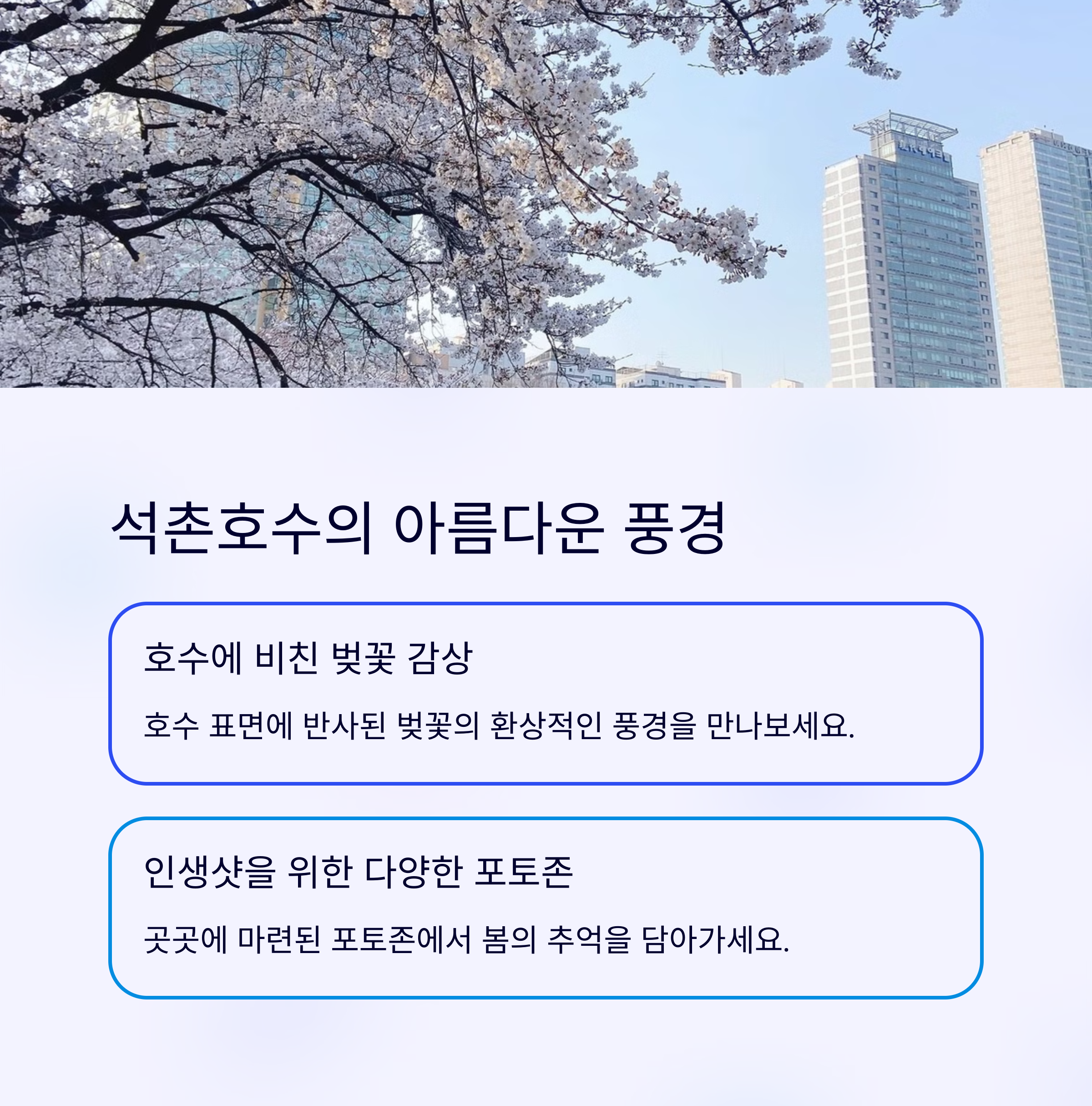 봄철 서울 대표 축제 장소 중 하나 자전거, 산책, 자연체험이 모두 가능한 복합공간 벚꽃이 호수에 비치는 낭만적인 서울의 봄