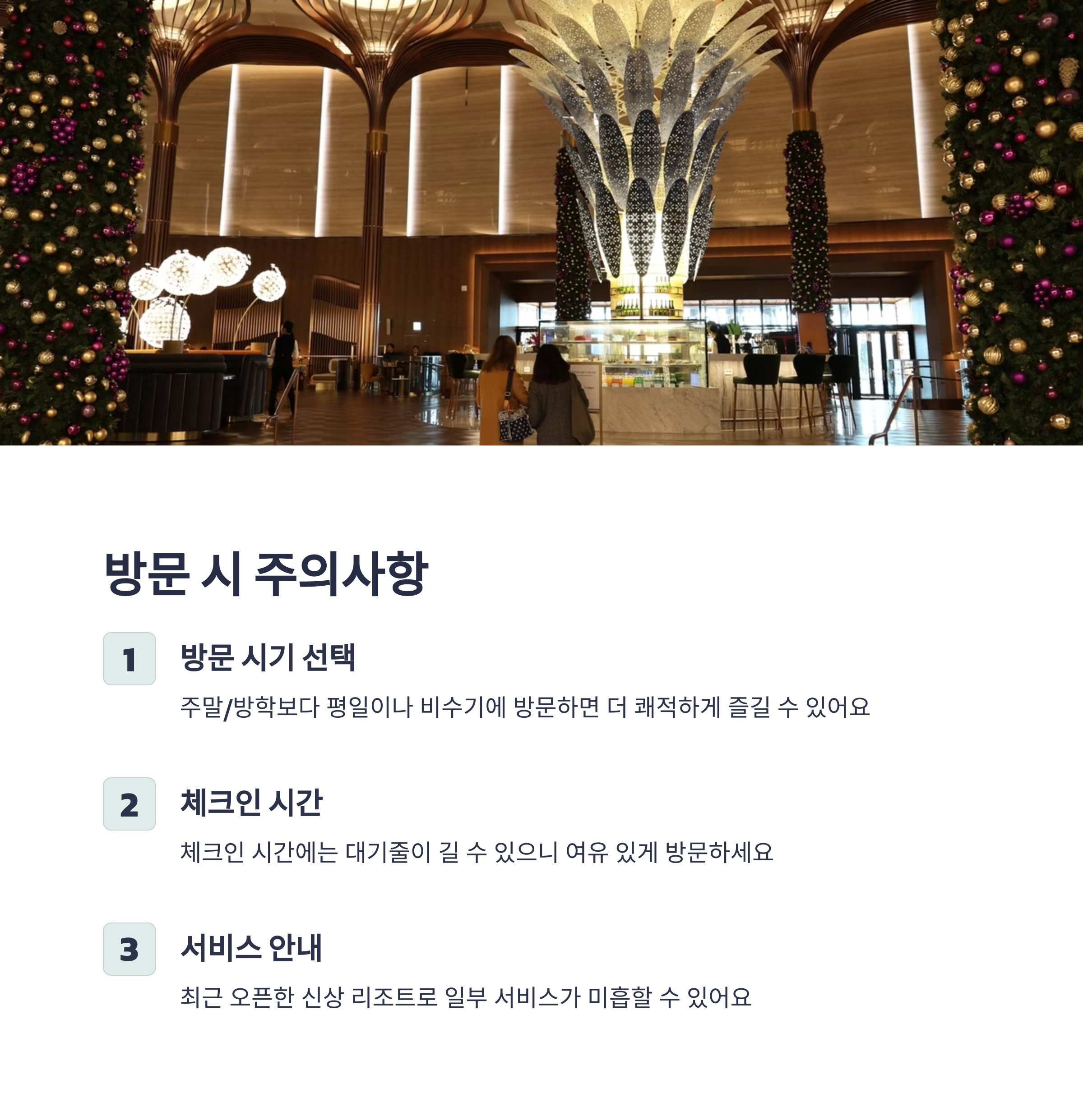 리조트 내에는 워터파크 ‘스플래쉬베이’, 레스토랑, 푸드코트, 쇼핑몰, 오락실 등 다양한 시설이 있어 하루 종일 리조트 안에서만 지내도 부족함이 없습니다. 다만 최근 오픈한 만큼 체크인 대기직원 응대 미숙 등은 개선이 필요한 부분입니다. 주말, 공휴일, 방학 기간에는 가족 단위 방문객이 많아 커플 여행자라면 평일이나 비수기 방문을 추천드립니다. 화려한 시각적 경험과 다양한 즐길 거리를 원한다면 인스파이어는 그 기대를 충분히 충족시켜 줄 것입니다.