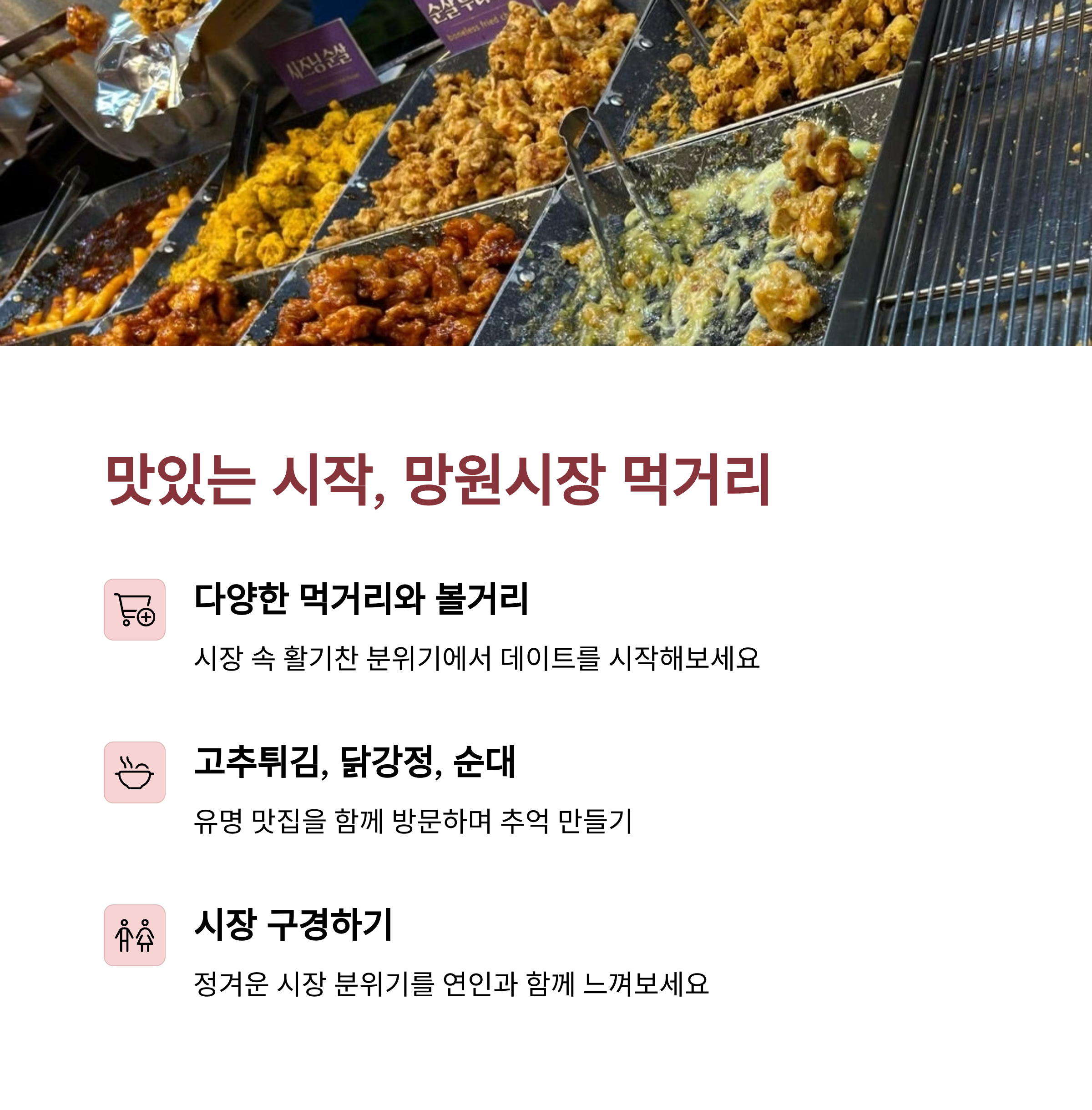 시장의 활기와 추억을 함께 담을 수 있음 | 서울함공원 등 특별한 경험까지 더함 | 24시간 운영으로 시간 제약 없이 즐김 |