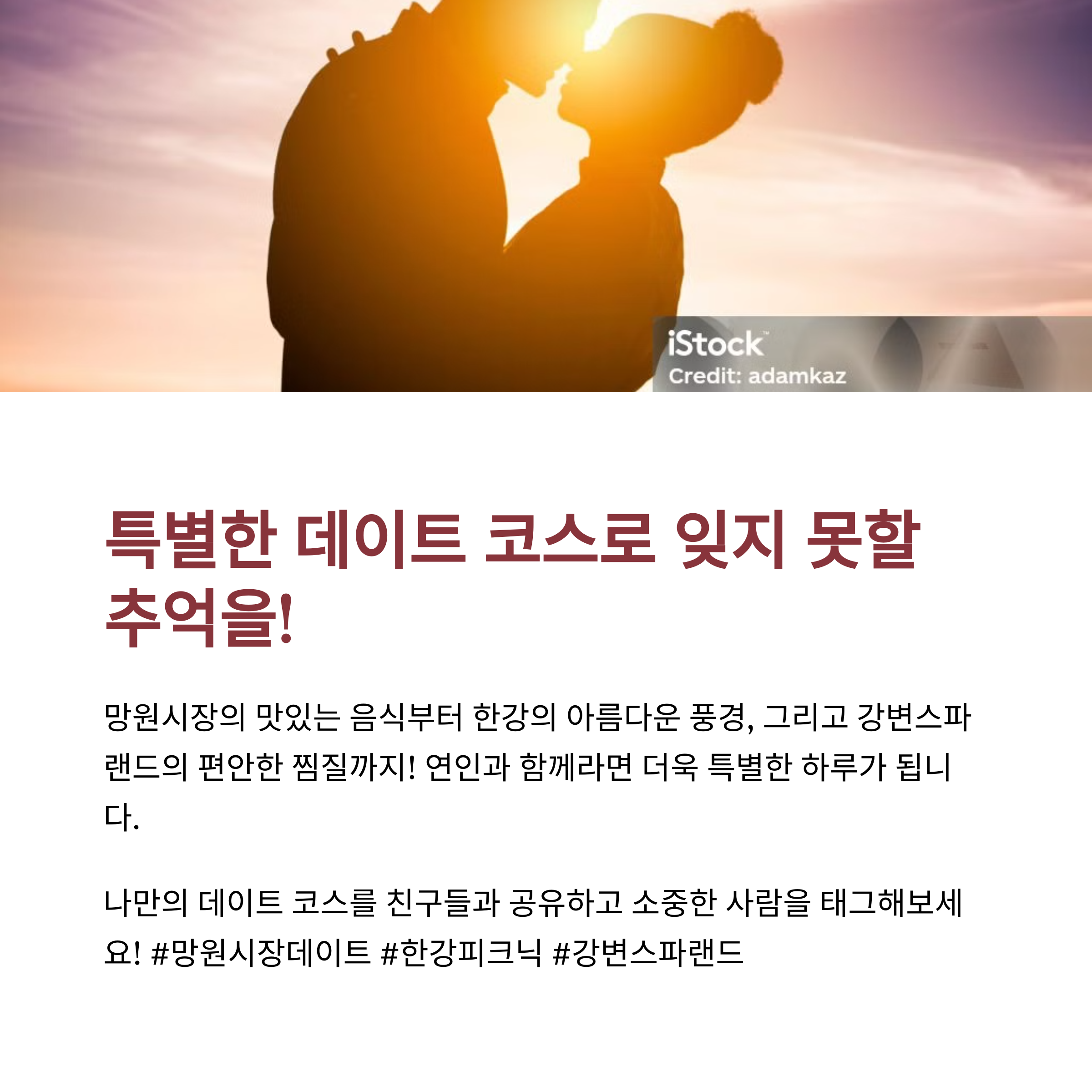 망원시장과 강변스파랜드를 연계한 데이트 코스는 서울 도심에서 하루를 알차게 보내기에 완벽한 구성입니다. 시장의 활기와 맛, 한강의 감성 피크닉, 찜질방의 힐링까지 데이트에 필요한 모든 요소가 자연스럽게 어우러집니다. 특별한 계획 없이도 충분히 즐길 수 있는 구성이라 누구에게나 부담 없이 추천드릴 수 있어요. 이번 주말, 따뜻한 봄바람과 함께 실속 있고 사랑스러운 데이트를 즐겨보세요.