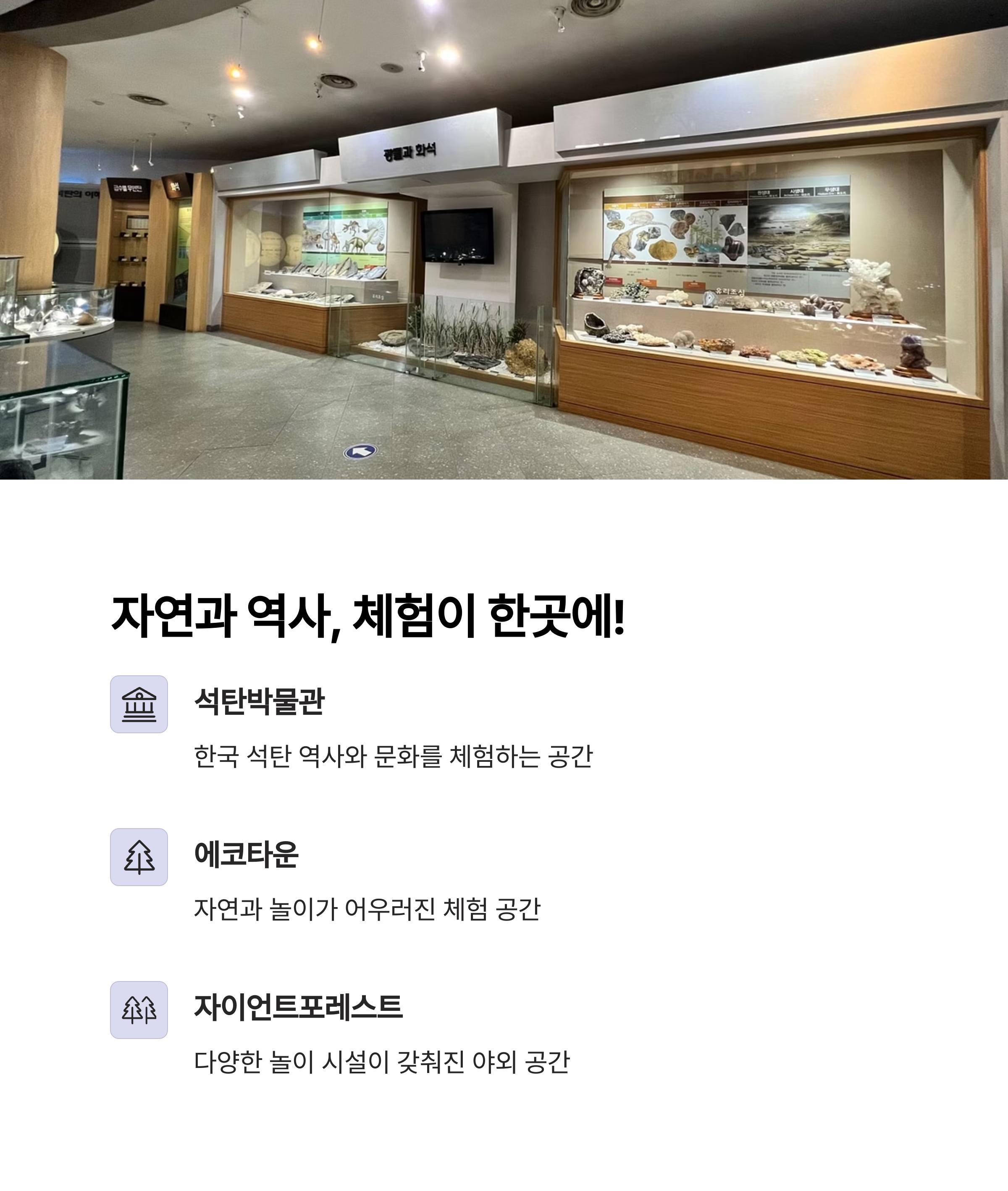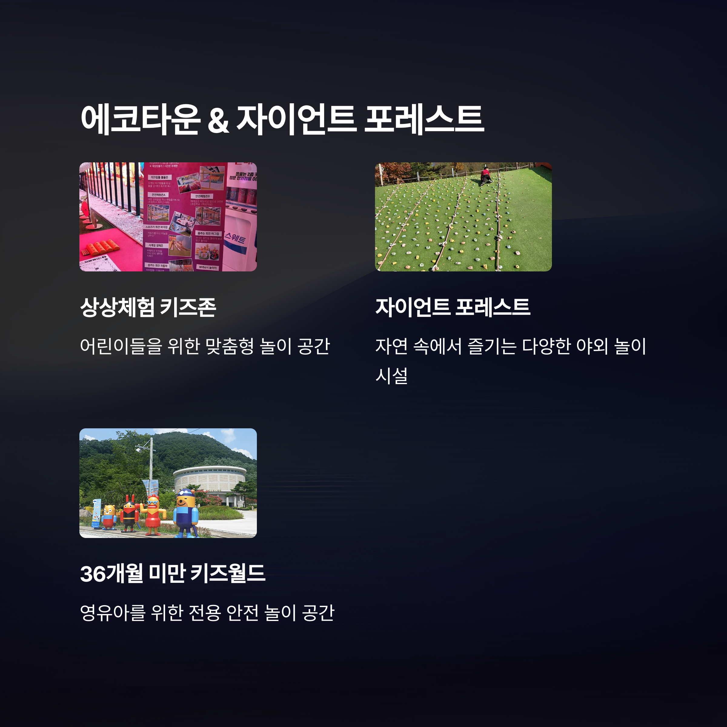 | 계절마다 다른 프로그램과 테마 체험 가능 | 생태학습, 모험, 감성놀이를 한 번에 경험 | 반짝이는 타임터널과 실제 갱도 재현 구간 포함 |