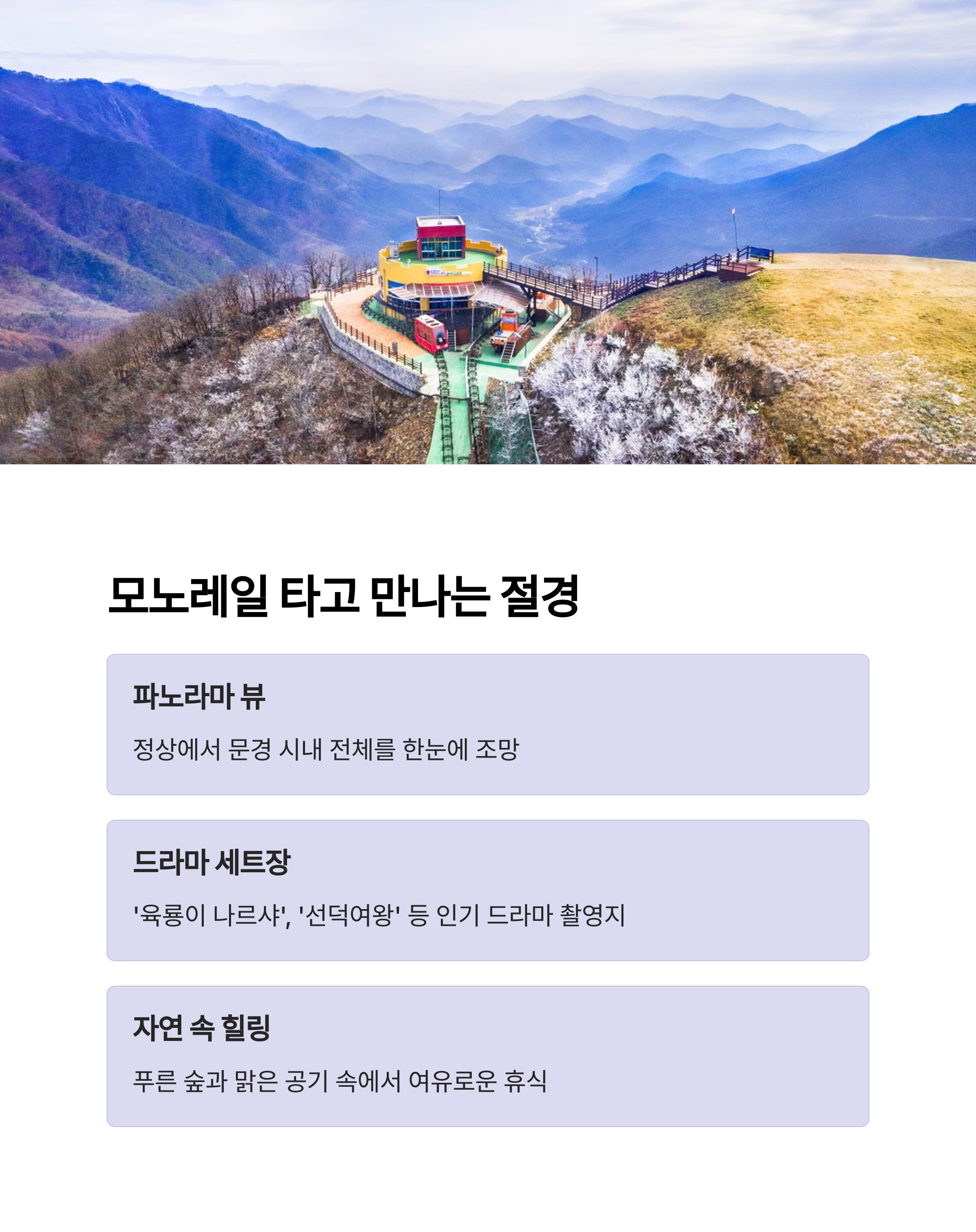 거미열차 외에도 문경에코월드에는 다양한 즐길 거리가 가득합니다. 모노레일을 타고 정상에 오르면 드라마 촬영지로 유명한 가은오픈세트장을 한눈에 조망할 수 있으며, 에코타운과 자이언트 포레스트는 아이들이 뛰어놀며 자연을 체험할 수 있는 최적의 공간입니다. 특히 에코타운에서는 자연 소재를 활용한 체험 활동이 마련되어 있어, 단순한 관람을 넘어 아이들이 스스로 탐색하고 배우는 환경을 조성합니다. 여러 세대가 함께 방문해도 모두가 만족할 수 있는 복합 체험공간입니다.