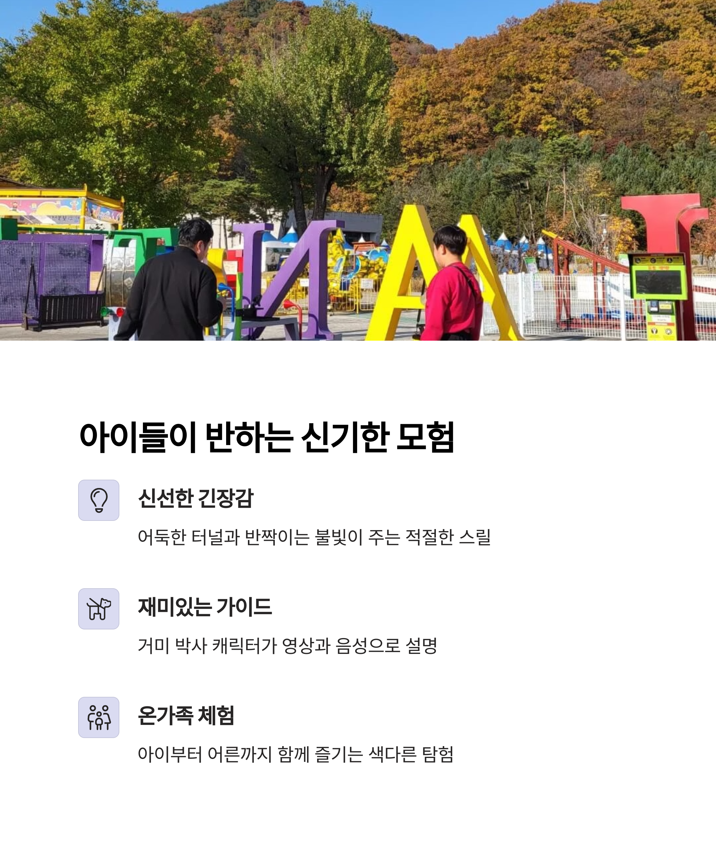 | 계절마다 다른 프로그램과 테마 체험 가능 | 생태학습, 모험, 감성놀이를 한 번에 경험 | 반짝이는 타임터널과 실제 갱도 재현 구간 포함 |