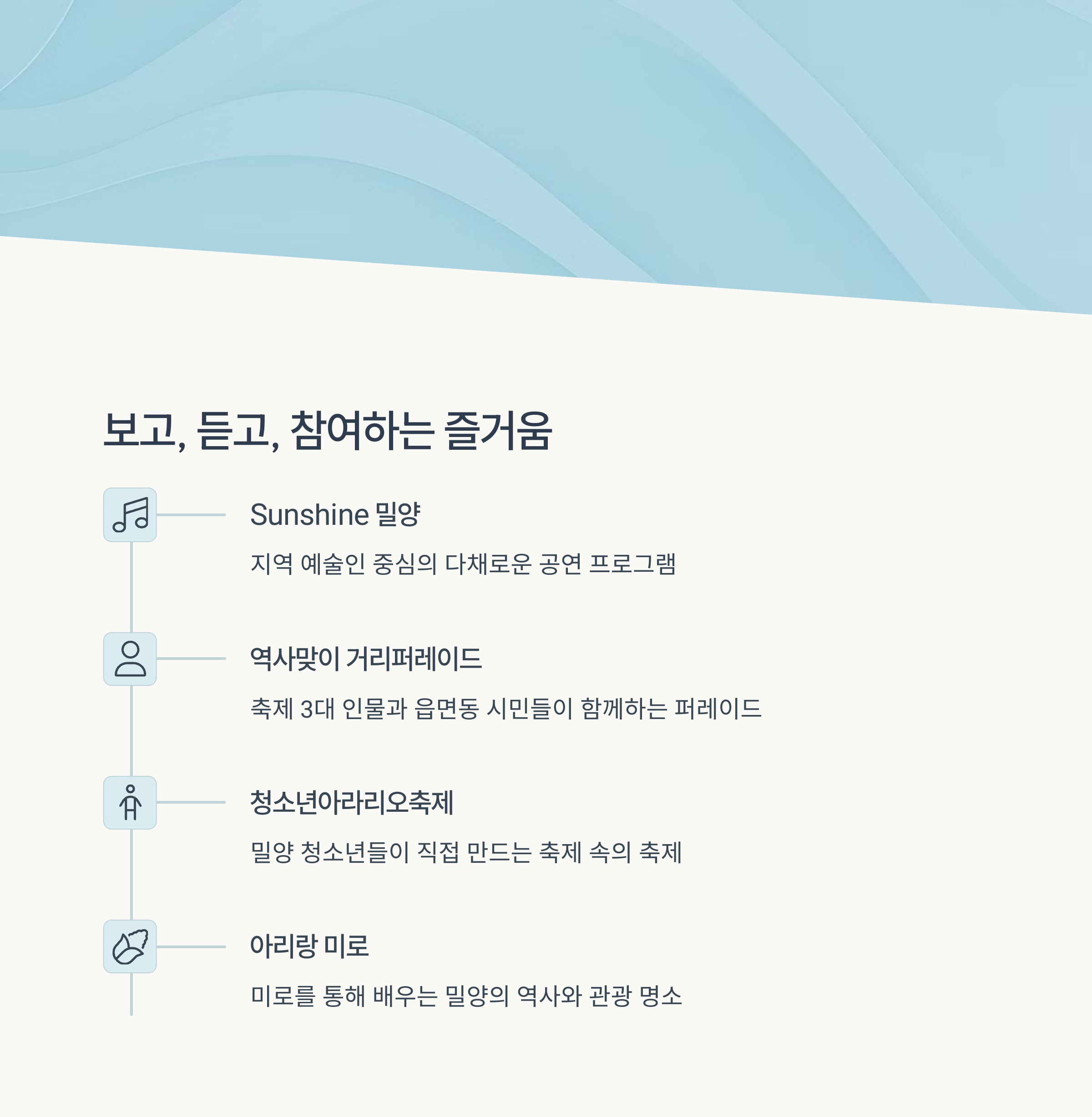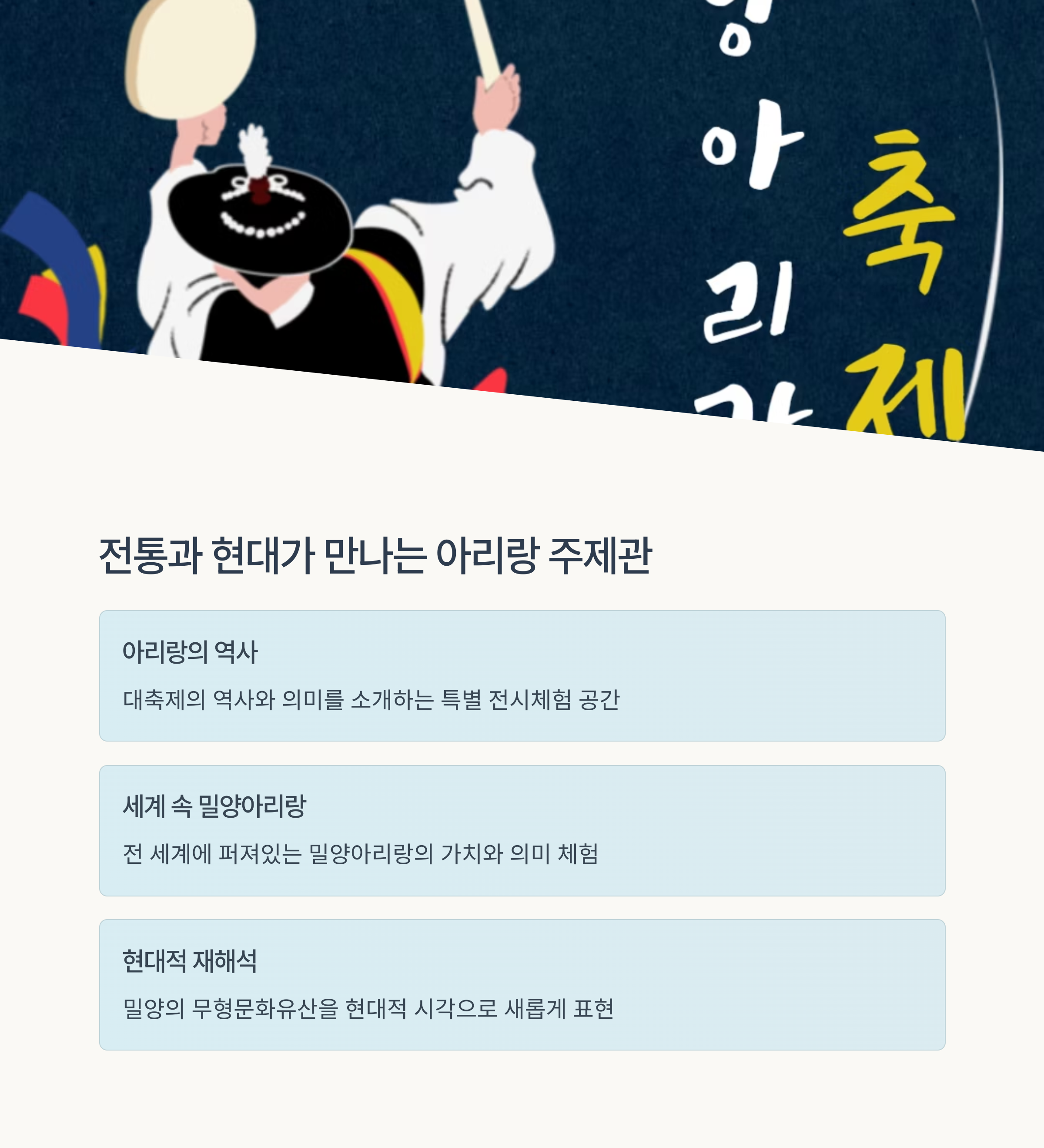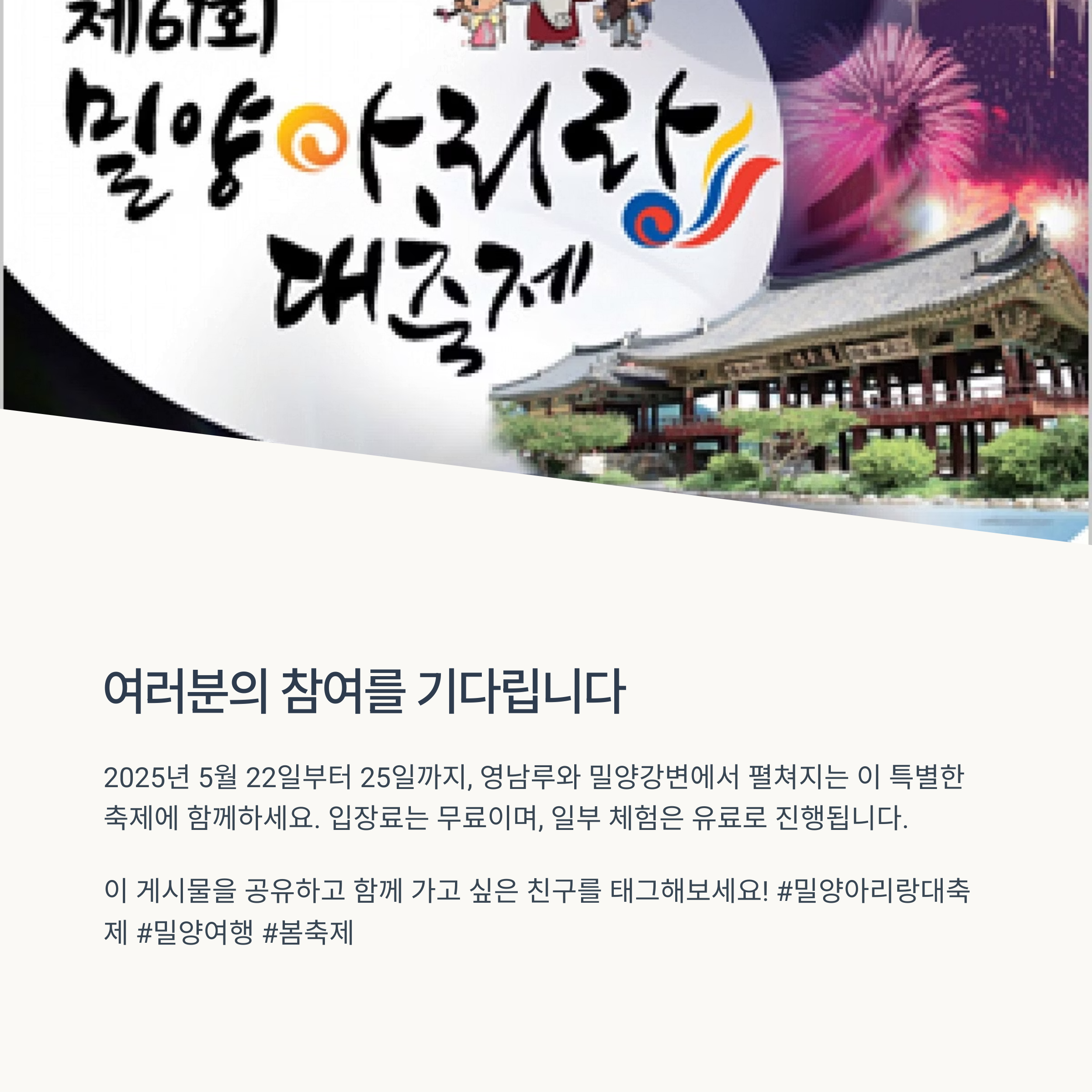 한복 인증샷, 가장 좋았던 공연, 놓치지 말아야 할 포인트 등 밀양아리랑대축제를 경험한 여러분의 생생한 후기를 댓글로 남겨주세요.