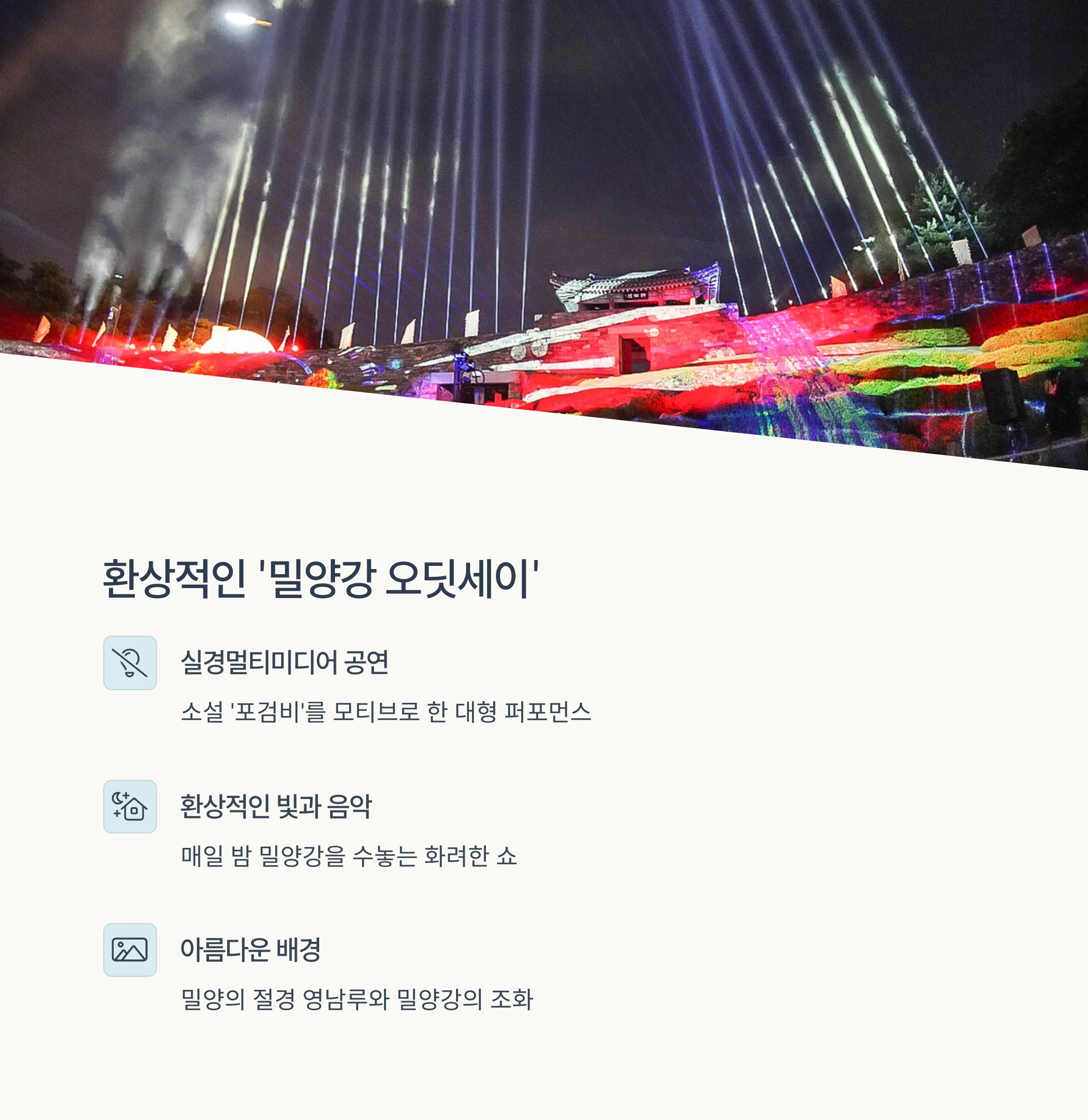 밀양 아리랑 대축제는 전통과 첨단 콘텐츠가 조화를 이루는 국내 대표 축제로, 특히 밤마다 펼쳐지는 ‘밀양강 오딧세이’는 소설 '포검비'를 기반으로 제작된 대형 실경 멀티미디어 공연입니다. 무대는 밀양강 전체이며, 음악, 영상, 조명, 배우의 연기가 밤하늘과 어우러져 한 편의 환상적인 오페라 같은 무대를 연출합니다. 매일 밤 다른 감동을 선사하는 이 공연은 밀양 축제의 백미이자 지역의 스토리텔링을 가장 아름답게 담아낸 콘텐츠로 관람객의 찬사를 받고 있습니다.