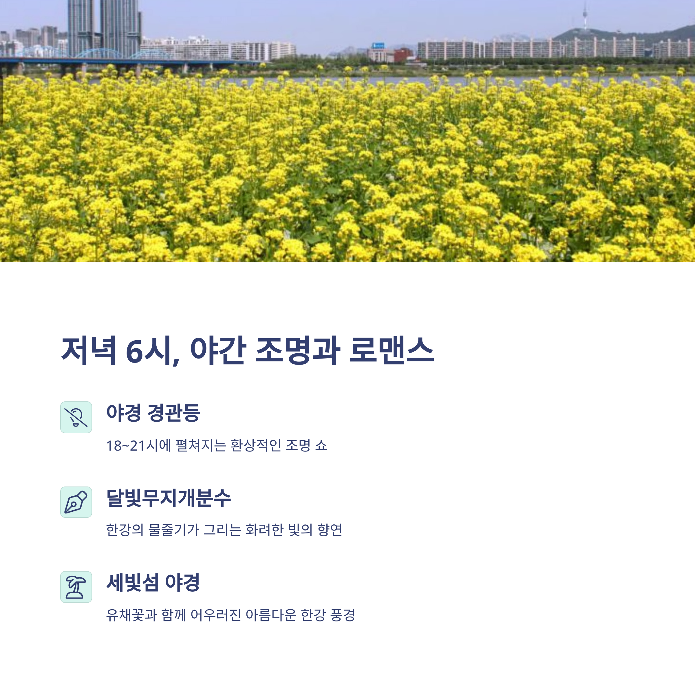 유채꽃 축제는 5월 10일부터 19일까지 운영되며, ‘유채찬란’이라는 주제 아래 포토존, 버스킹 공연, 꽃차 체험 등 다양한 프로그램이 준비되어 있습니다. 특히 저녁 6시 이후에는 조명이 더해져 낮과는 다른 매혹적인 분위기를 자아냅니다. 연인들은 이곳에서 밤 산책을 즐기며 세빛섬의 반짝이는 조명과 달빛무지개분수의 물줄기 아래에서 잊지 못할 추억을 만들 수 있습니다.